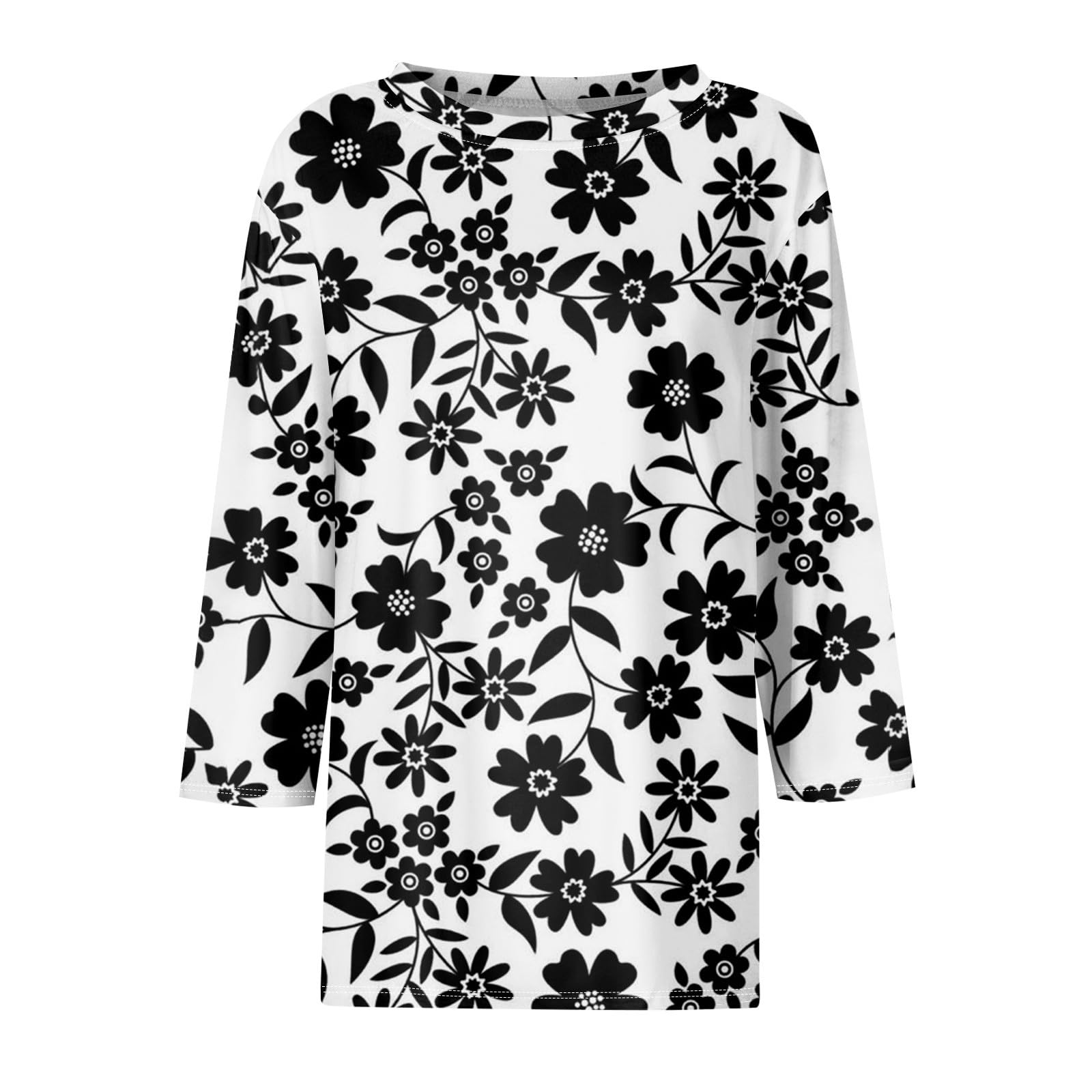 Black Women Shirts 3/4 Sleeve Crewneck Womens Summer Tops Casual Three Quarter Sleeve Tees Tunic Floral Print Summer Blouses M