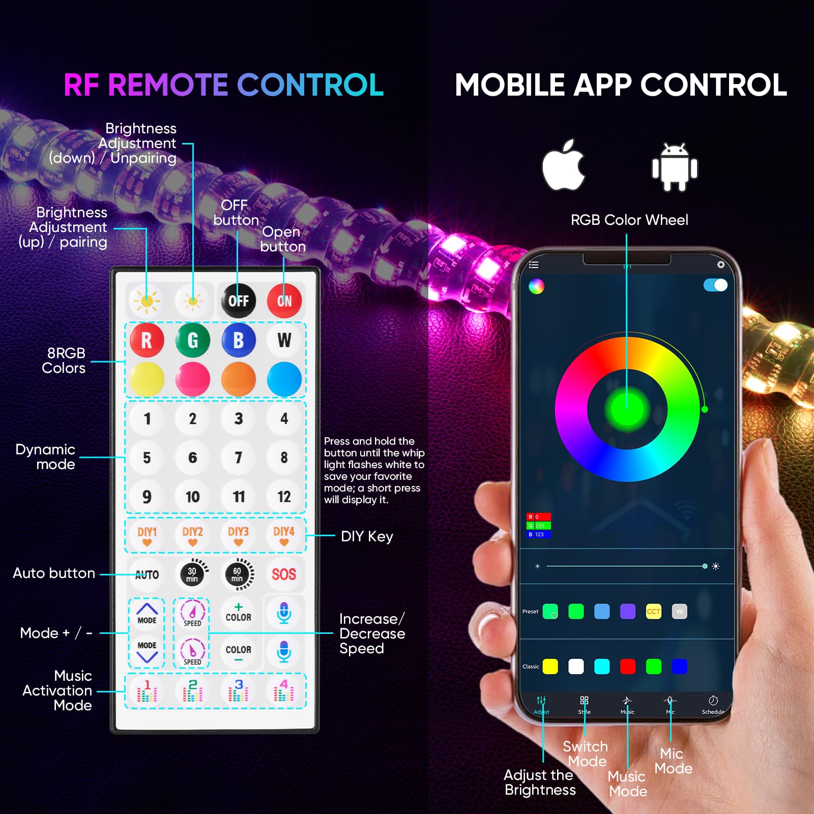 - Dual Control & Music Sync - Effortlessly customize colors, brightness, and patterns using the app or remote control. These ATV LED whip lights sync with your music beats via the app or your phone's microphone, creating an immersive off-road experience with synchronized sound and light. (Tip: Adjust the external mic's sensitivity in the app before using the music sync feature.)