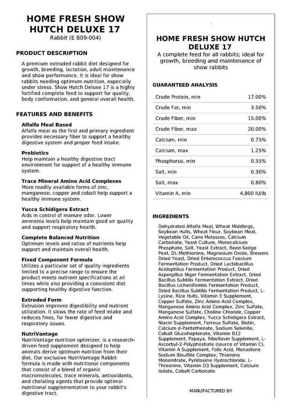 Blue Seal Home Fresh Show Hutch Deluxe 17 is a premium extruded rabbit diet designed for growth, breeding, lactation, adult maintenance and show performance. It is ideal for show rabbits needing optimum nutrition, especially under stress