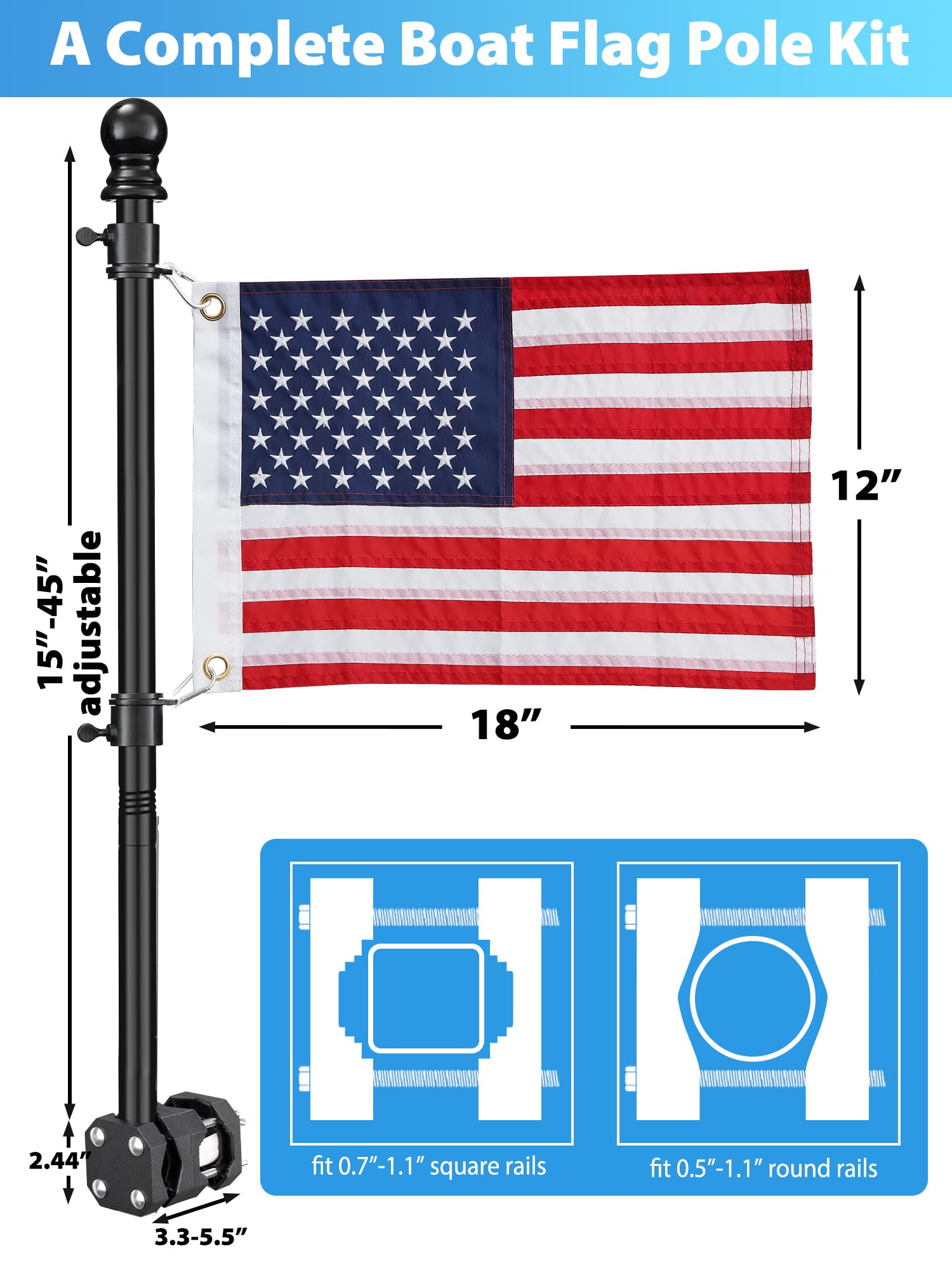 - All-Inclusive Boat Flag Pole Kit: Your one-stop solution for a patriotic display on the water, our flagpole kit include: a 12''x18'' embroidered American flag, a 15”-45” height-adjustable black flag pole, a universal mount holder that fits both square and round rails, along with 2 tangle-free rings for smooth flag display.