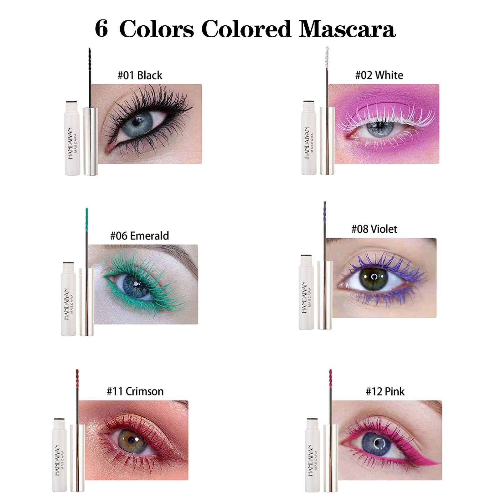 - 【6 Colored Mascara Set】 It has 6pcs vivid colors: black,white,green,purple,red, pink. Colored mascaras make you have shinning big eyes, releasing your charm. What’s more, you could have different mood in week, sticking you out from the crowd.