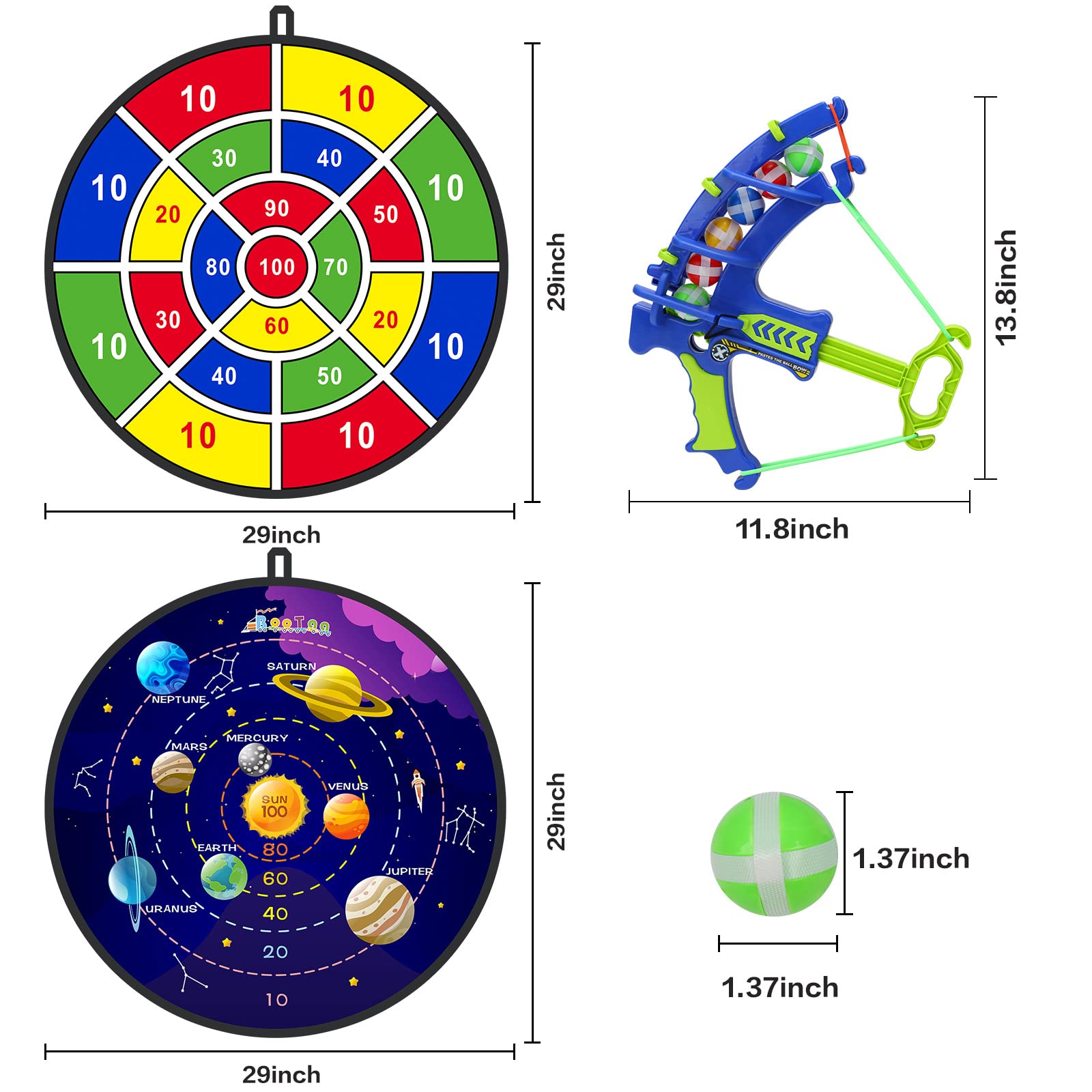 - 29' LARGE DART BOARD WITH BOW SET & 20 STICKY BALLS --- Dart board's diameter is 29 inches, large size means higher hit rates and more fun for kids/ beginners. The dart board toy set is made of high-quality soft fabric, durable. Plastic sticky balls have strong stickiness. Package include: 1* large board, 1*Blue Bow, 20* sticky balls (4 colors), 1* hook. With these abundant accessories, you are allowed to start your fun immediatly.