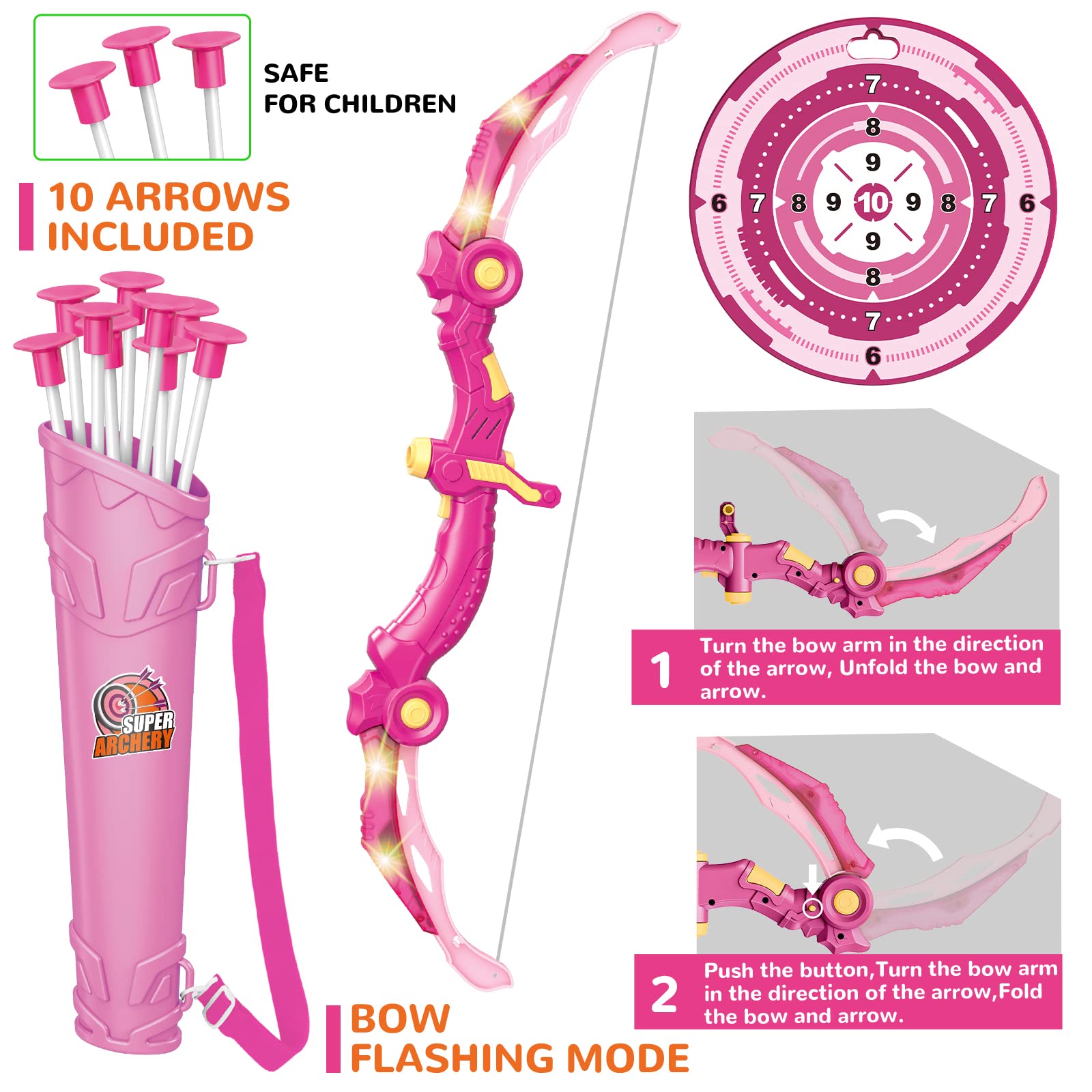 - Super Value Bow and Arrow Set: Our Bow and arrow set comes with beautifully detailed 1 luminous folding bow, 1 quiver, 1 detachable target board and 10 suction cup arrows. 2*AA batteries needed (not included). A perfect indoor or outdoor game suitable for girl toys 5, 6, 7, 8, 9, 10, 11, 12 years old. Tart aiming & firing right away! Arrows come with a suction-cup head that safely sticks to targets.