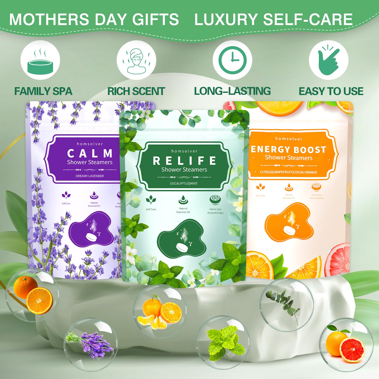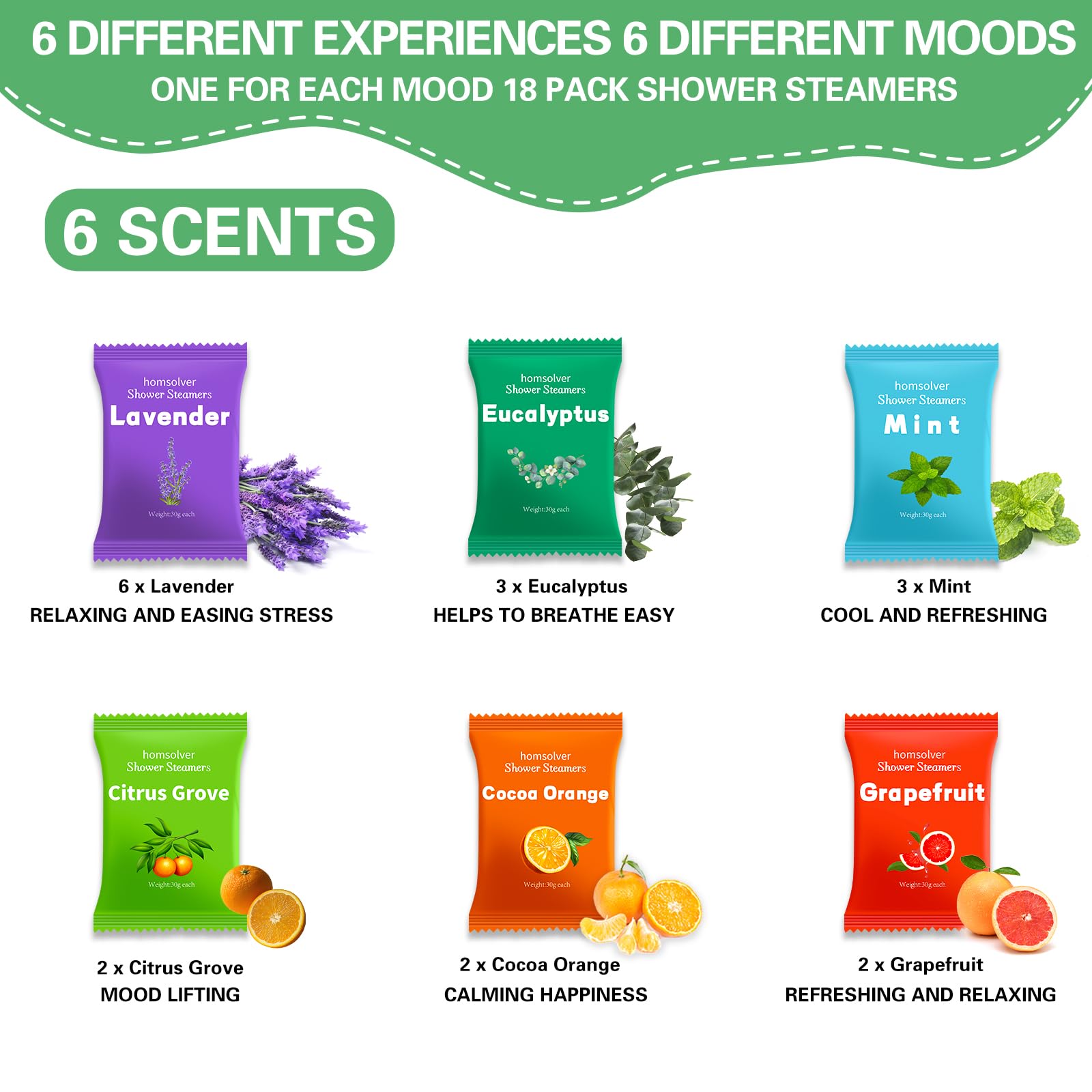 - Shower Steamers of 18 Packs: Shower steamers 18 packs gifts set box are 3 individual bags with 6 different scents eucalyptus, mint, lavender, grapefruit, cocoa orange, and citrus grove. They are essential oils extracted from natural plants and fruits, high density, long lasting, and refreshing fragrances. After a busy day, relax and unwind with these shower steamers aromatherapy, which makes you feel relaxed and comfortable, and relieves relief. It is the unique best gifts for mom
