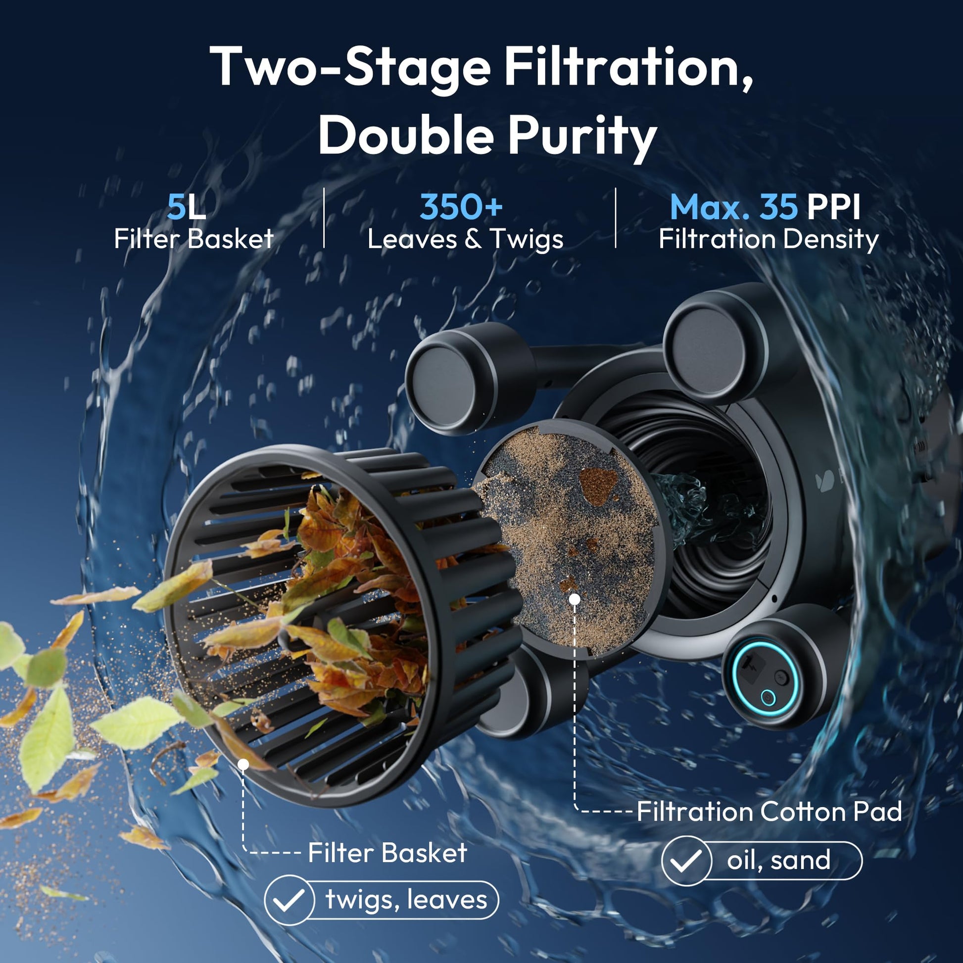 - Deep & Powerful Cleaning with Bluehole Tech: Equipped with advanced dual-layer filtration—basket + filter pad—BuVortex V5 pool skimmer robot effortlessly captures everything from leaves and twigs to oil and sand. Its massive 5L filter box holds over 350 leaves, while the built-in overflow prevention net keeps debris securely inside. No more mess during movement or stops!