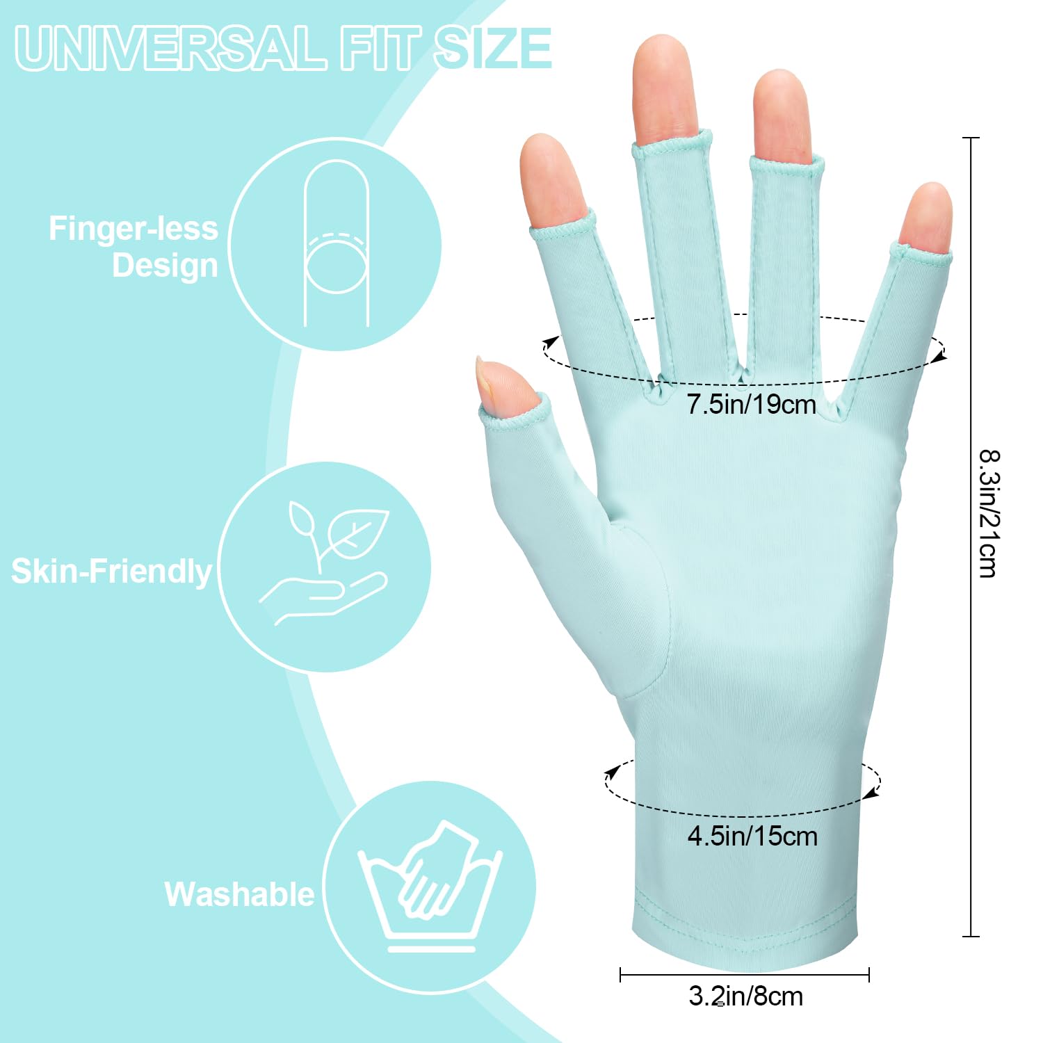 - Fingerless Design: The gloves feature a fingerless design, allowing you to have complete control and freedom of movement while applying gel polish, curing under the lamp, or shaping your nails. The fingerless style ensures optimal visibility and precision, enabling you to create the perfect salon-quality manicure every time.
