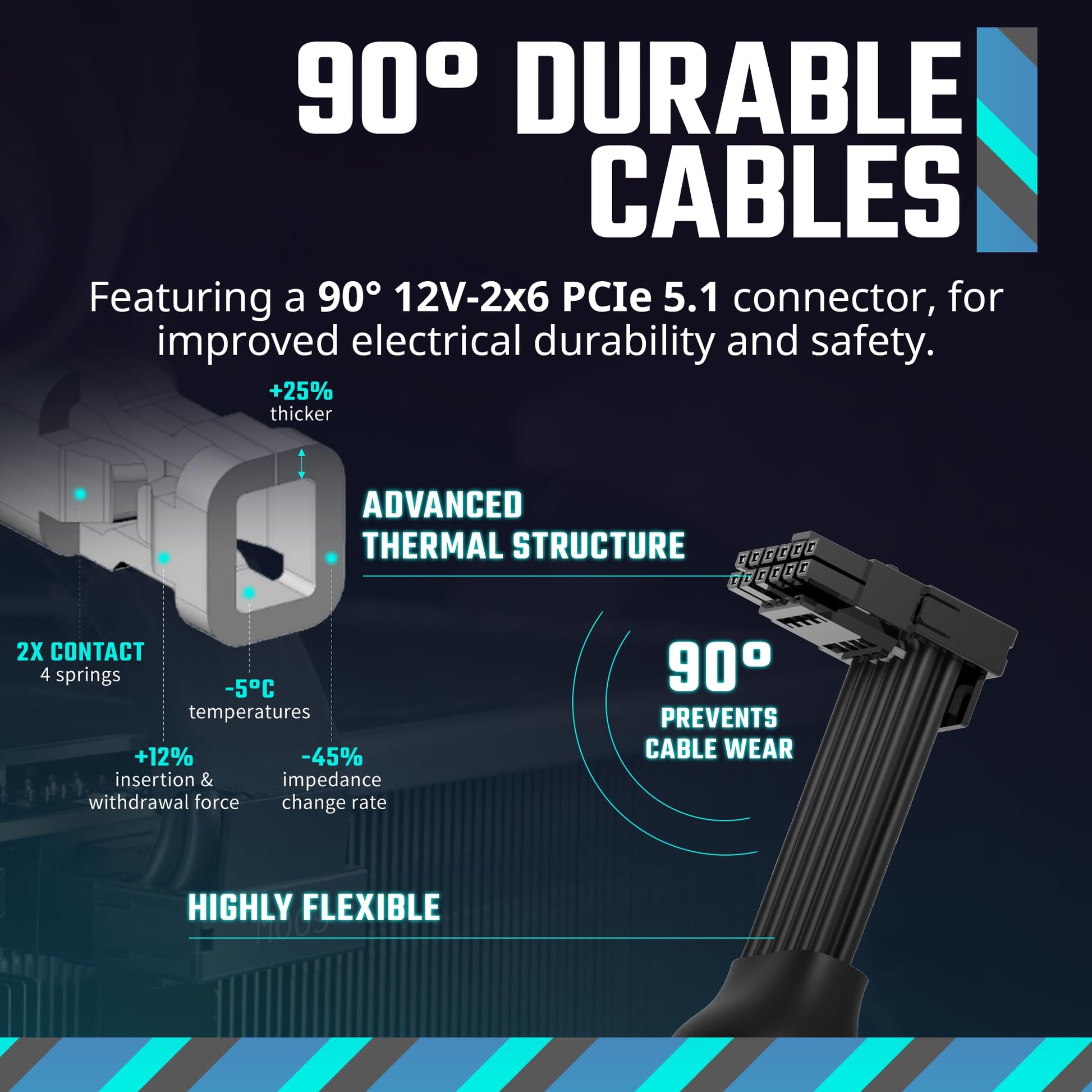- 90° Durable Cables: Featuring a 90° 12V-2x6 PCIe 5.1 connector, for improved electrical durability and safety.