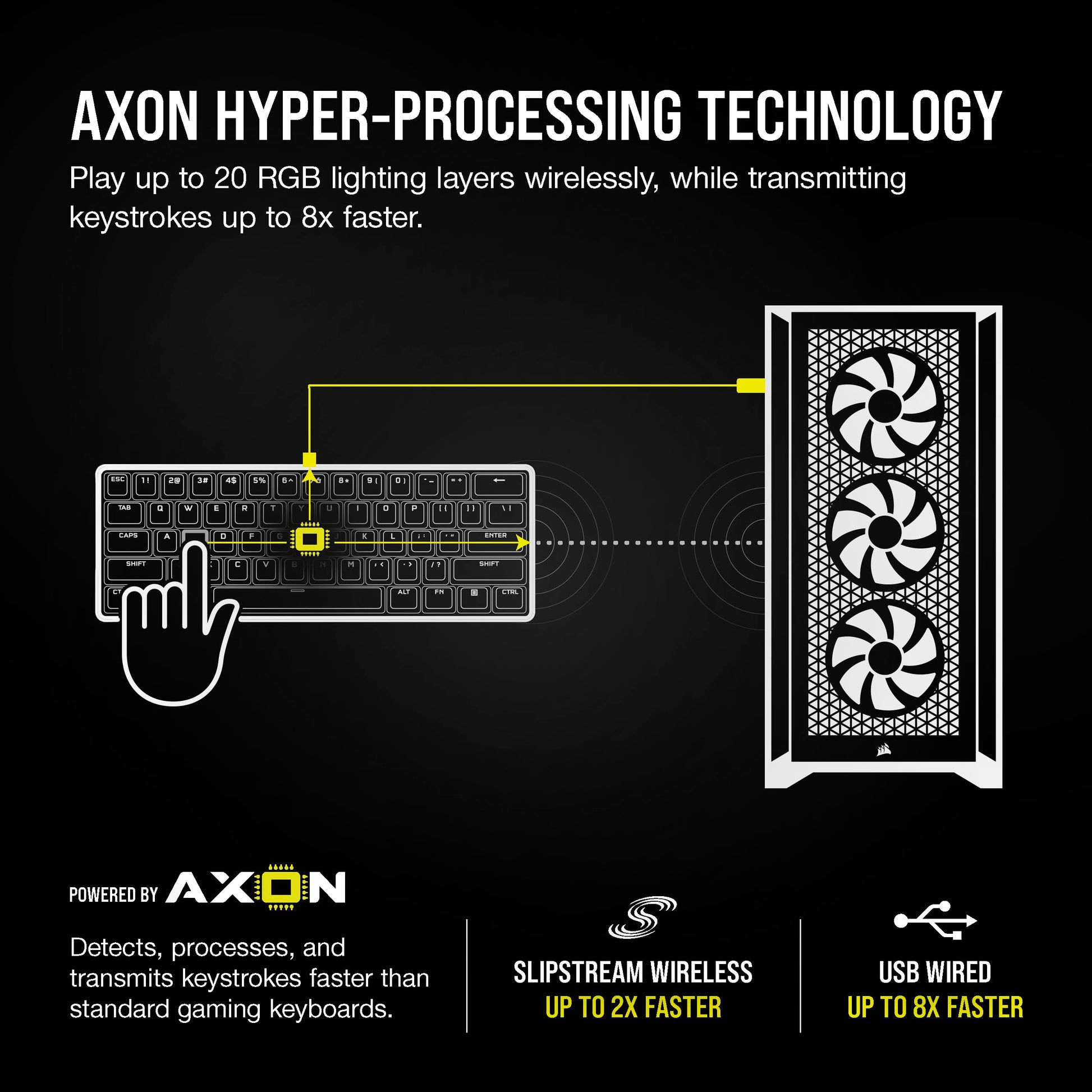 Details: The CORSAIR K100 AIR Wireless Mechanical Gaming Keyboard delivers outstanding performance with an unbelievably thin brushed aluminum frame, connecting wirelessly with sub-1ms SLIPSTREAM WIRELESS and Bluetooth®, with secure AES 128-bit encryption. Tactile CHERRY MX Ultra Low Profile mechanical keyswitches are illuminated by brilliant per-key RGB, for the responsiveness and customizable lighting you demand of a premium gaming keyboard. Four dedicated, fully programmable macro keys boost your gameplay or productivity. Wired mode enables CORSAIR AXON Hyper-Processing Technology to transmit keystrokes up to 8x faster, while powerful CORSAIR iCUE software unlocks dynamic wireless RGB lighting control, key remaps, macro programming, and more. With up to 200 hours of wireless battery life, the K100 AIR enables you to play elevated.