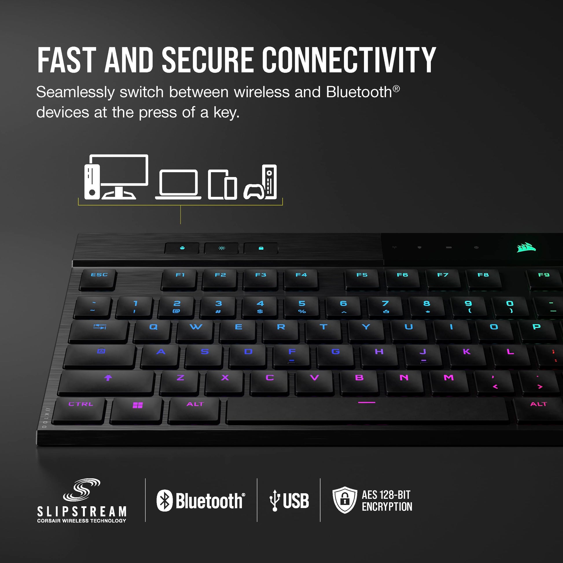 - Masterful Wireless Multi-Tasking: Quickly switch between wireless connections on your PC, Mac, and more at the press of a key, with secure AES 128-bit encryption.