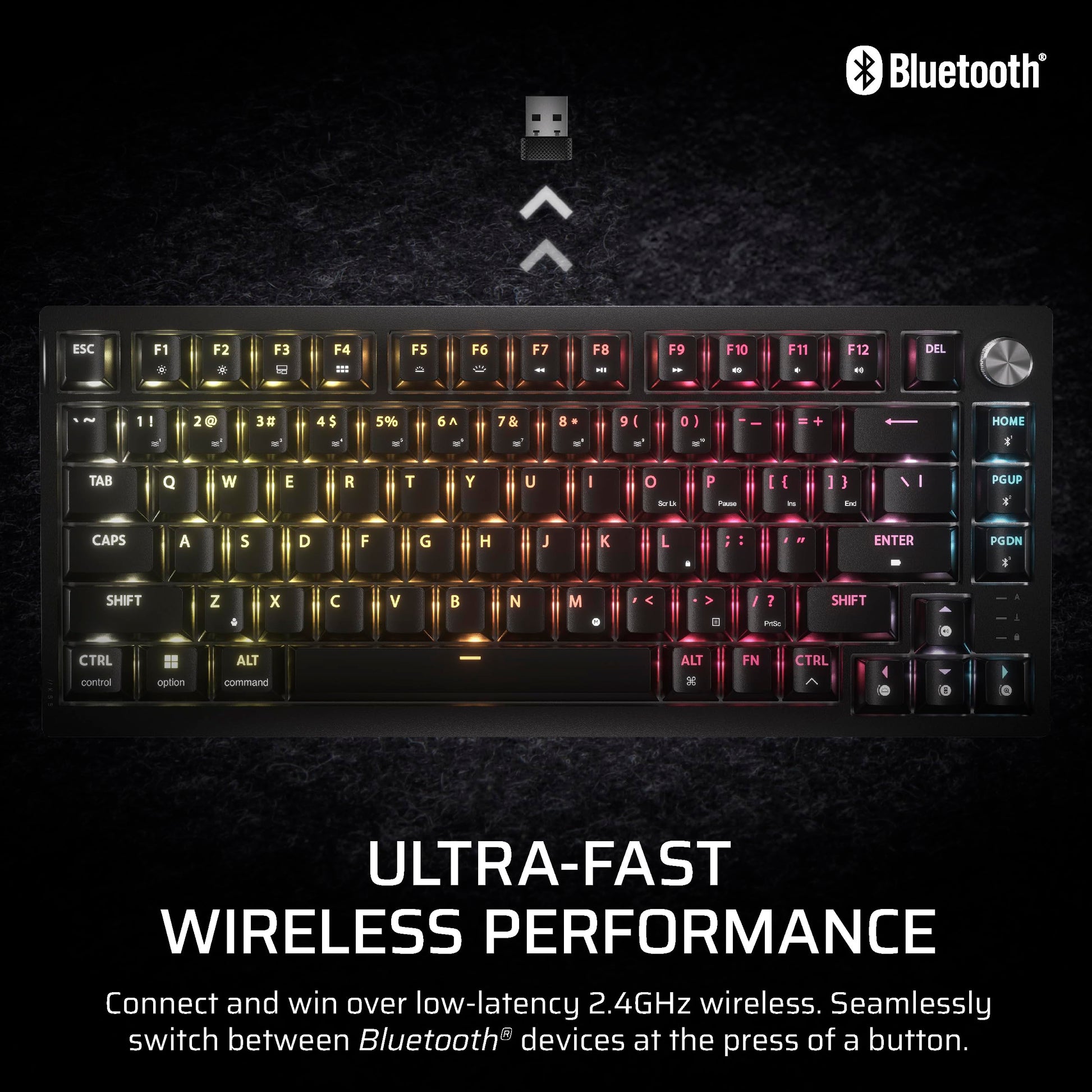 Details: Stand out from the crowd with superior skill and distinctive design. The CORSAIR K65 PLUS WIRELESS 75% hot-swappable keyboard maxes out on performance and personality. Step up your switches with pre-lubricated CORSAIR MLX Fusion tactile switches that feature satisfying feedback and a consistent typing feel. Durable PBT double-shot keycaps allow vivid per-key RGB to shine through, while resisting wear and fading over time. Integrated sound dampening tempers clacks and pings, so you can enjoy subtle, pleasant acoustics as you play. Connect to PC, Mac, and other devices via ultra-fast 2.4GHz wireless or Bluetooth, and power through playing sessions for longer than ever – up to 266 hours on a single charge.
