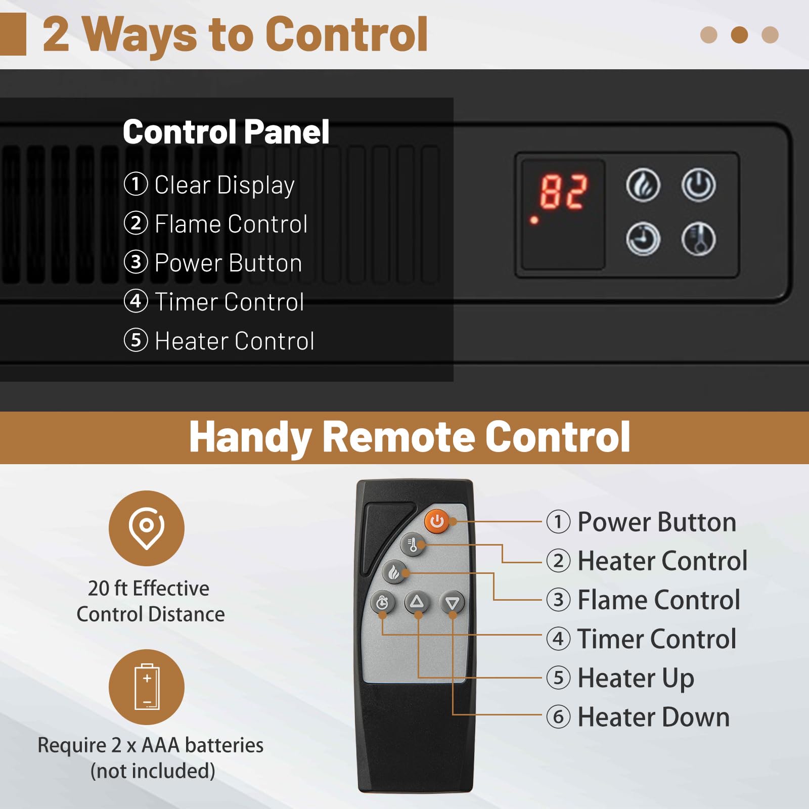 - [2 Control Methods] The convenient control panel with a clear LED display will show you the number.And the full-featured remote control with 33 ft effective control distance allows you to operate power on/off, heater control, flame control, timer control and heater up/down.