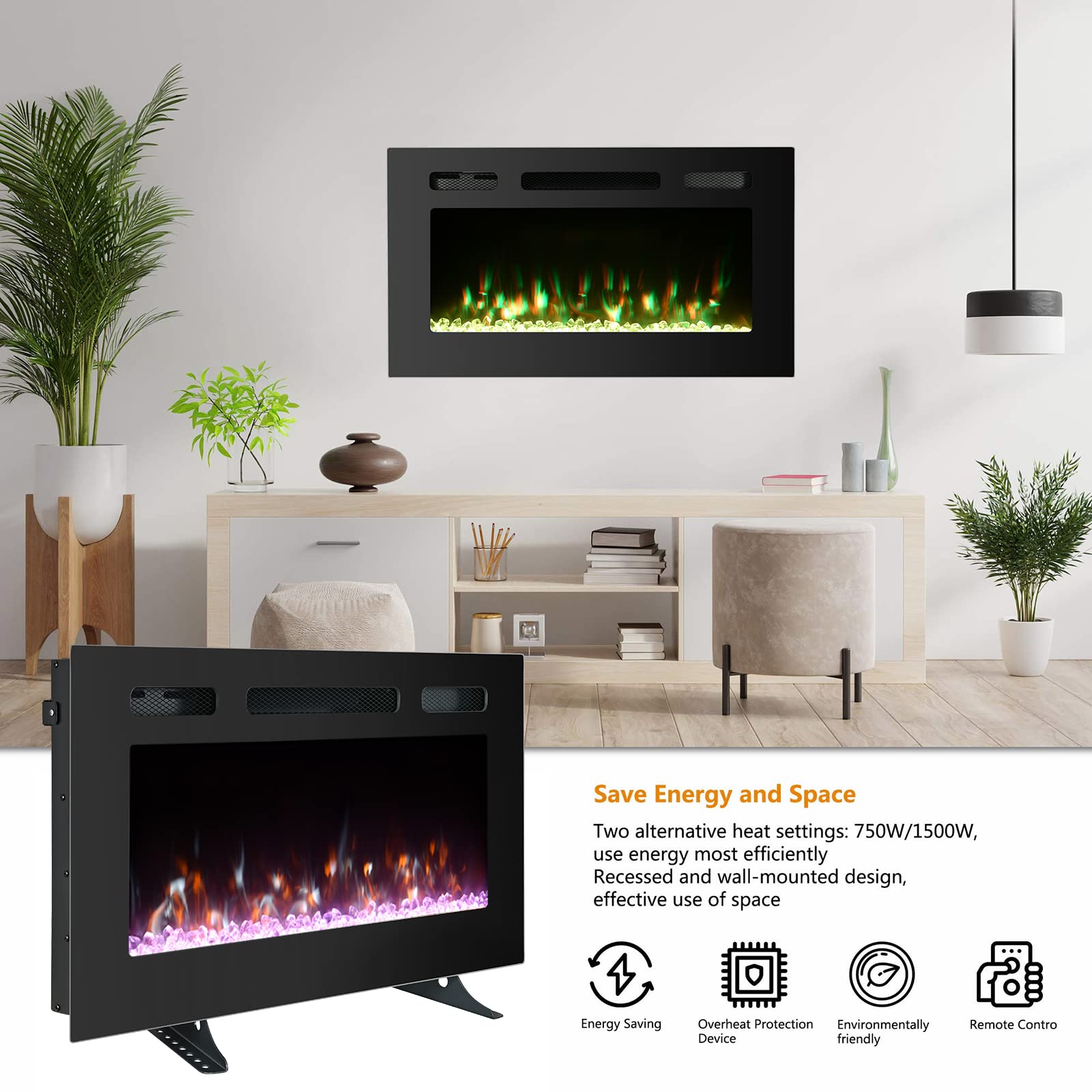 Cozy Daisy Electric Fireplace Heater,Wall Mounted and in-Wall Recessed,with Touch Screen, Realistic 12 Color Flame, Remote Controller/Log & Crystal Hearth Options,750W-1500W,Black (30 inch)