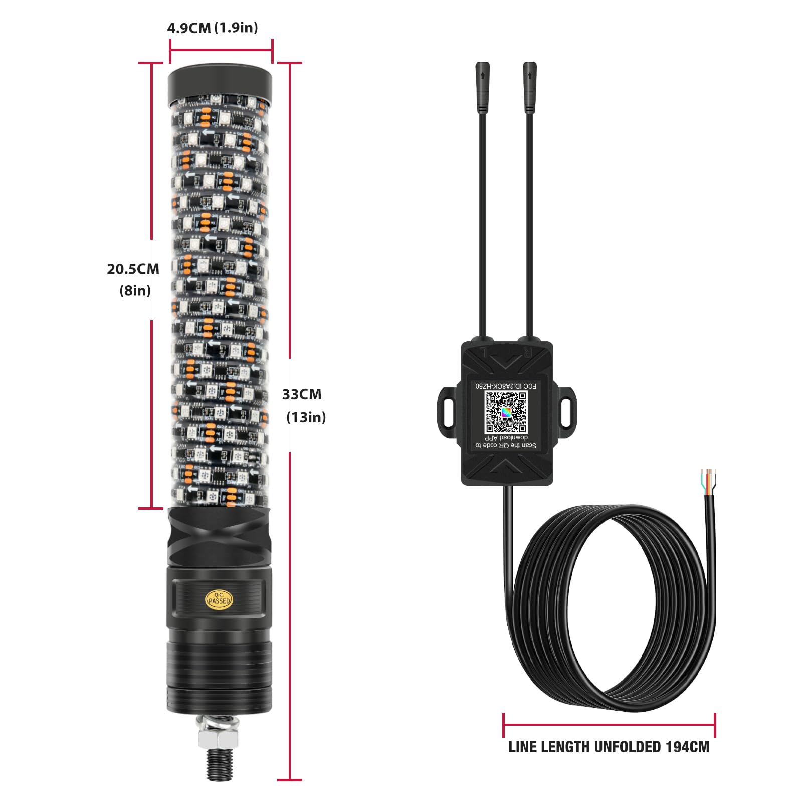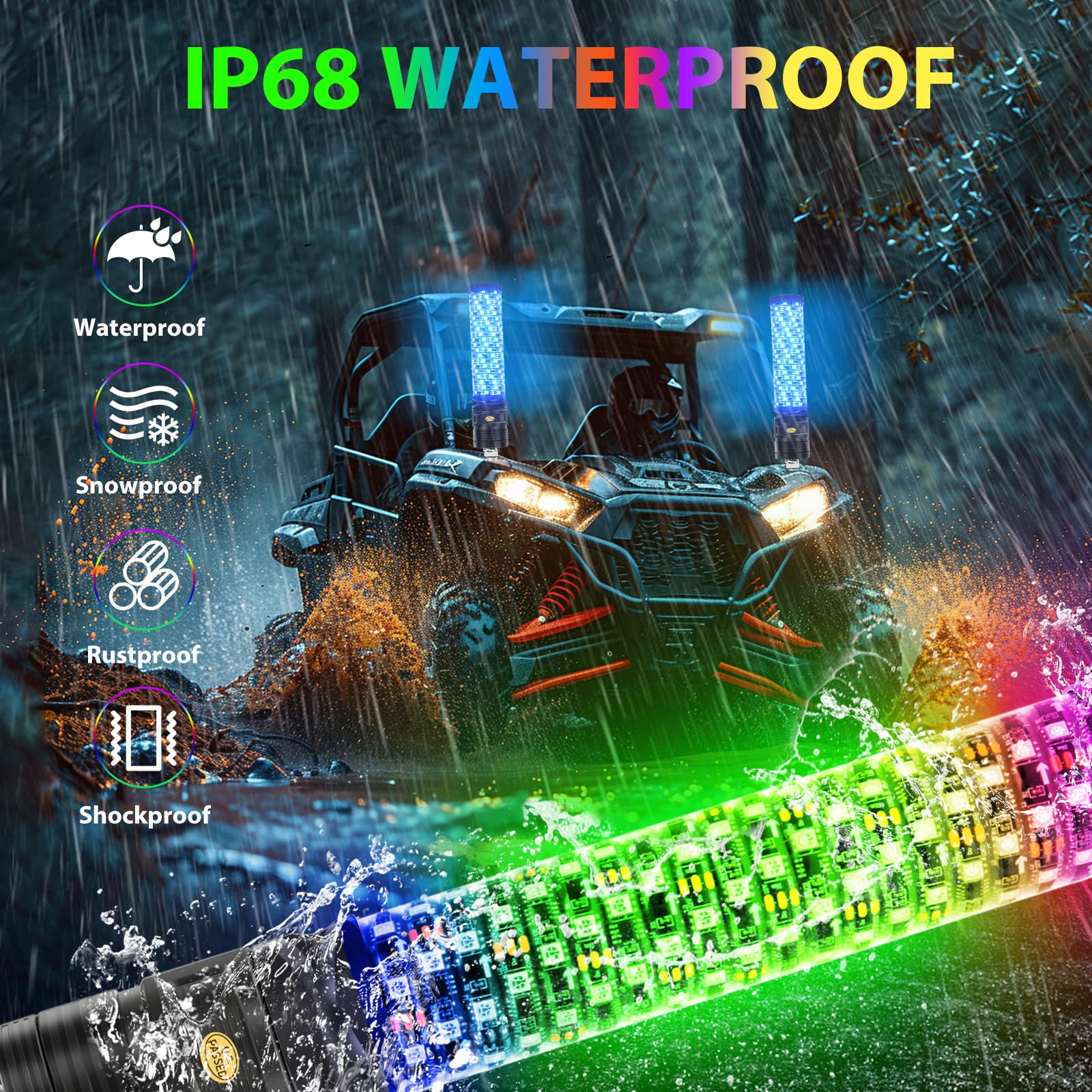 - 【Durable and Waterproof】The LED whip light is wrapped with glass fiber and high-tenacity EVA transparent heat shrink tube, which has good sealing performance, waterproof rating reaches IP68, dustproof, corrosion-resistant, bendable, and prevents cracking or breaking. The fat whip light is 1.8 inches in diameter. The package includes 1 pair of whip lights, a control box, and a remote control.