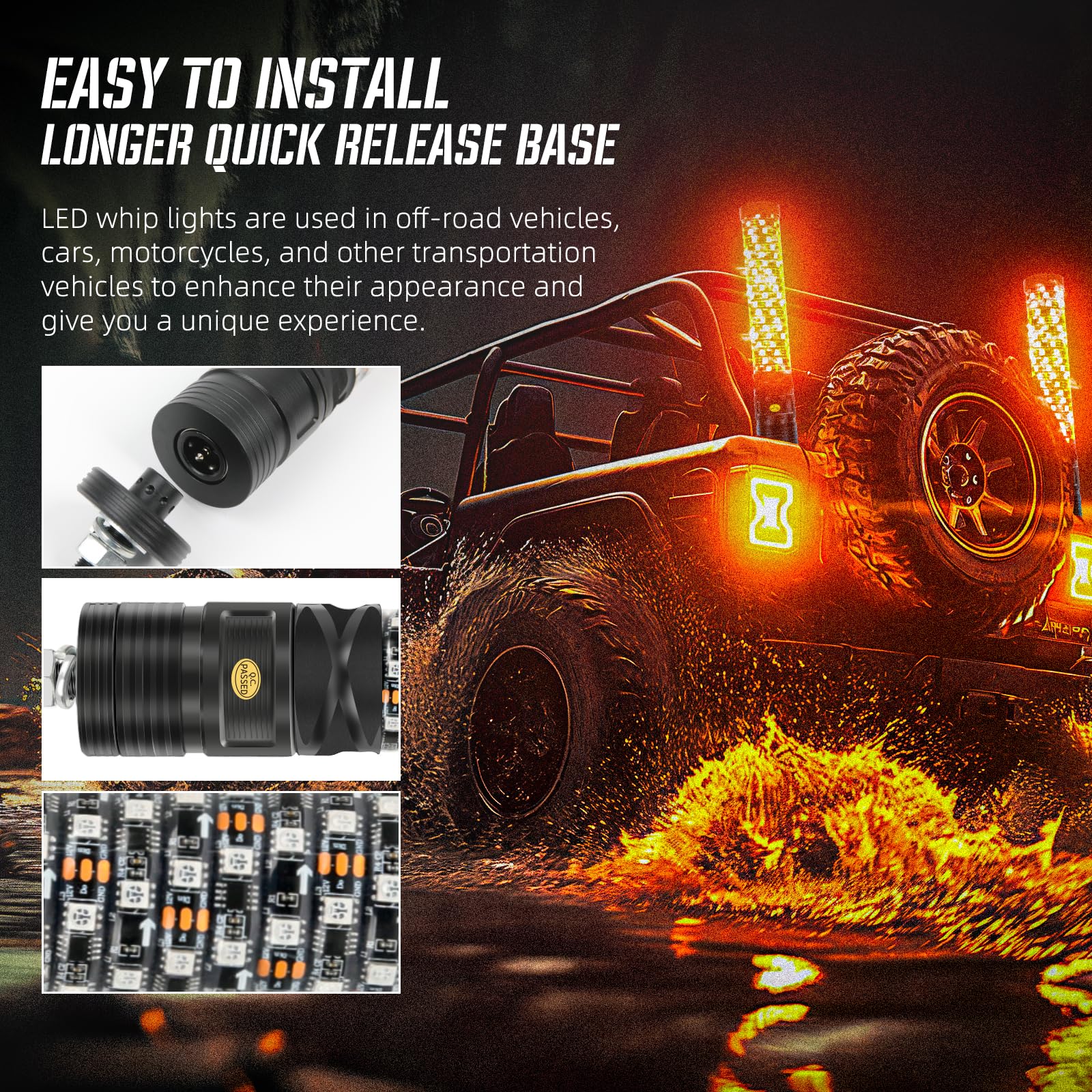 - 【360°Spiral Design & Applicable Car Models/Occasions】Using a more tightly coiled LED design, the whip-like glow of the antenna lighting can provide brighter colors and uniform light in the 360°direction than other products. Not only can it be widely used in off-road, motorcycles, ATV/SUV/UTV, boats, etc., it can also be used in indoor, deck lights, ambient lights, neon lights, etc.