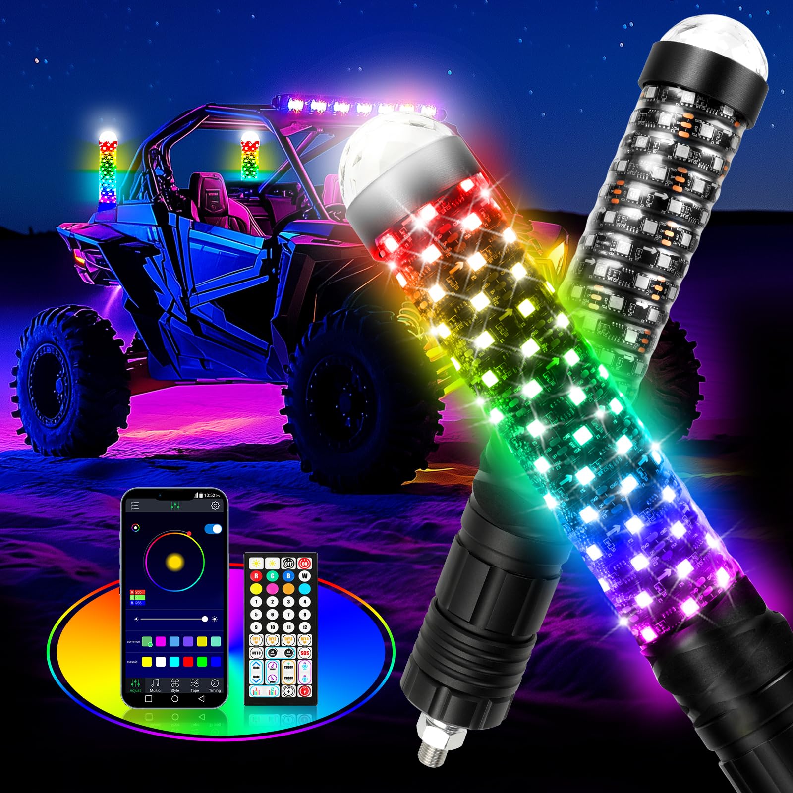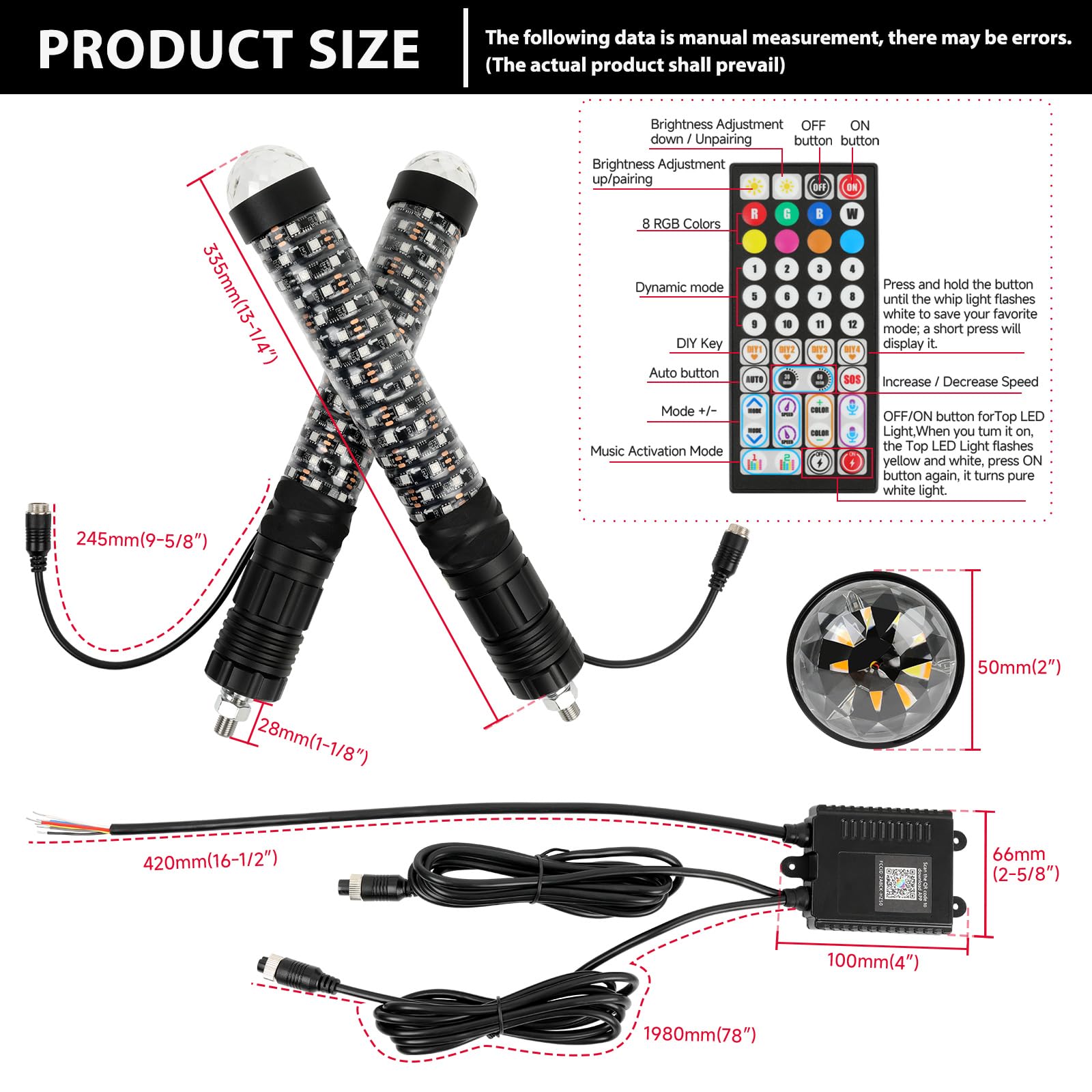 - 【Durable and Waterproof】The LED whip light is wrapped with glass fiber and high-tenacity EVA transparent heat shrink tube, which has good sealing performance, waterproof rating reaches IP68, dustproof, corrosion-resistant, bendable, and prevents cracking or breaking. The fat whip light is 1.8 inches in diameter. The package includes 1 pair of whip lights, a control box, and a remote control.
