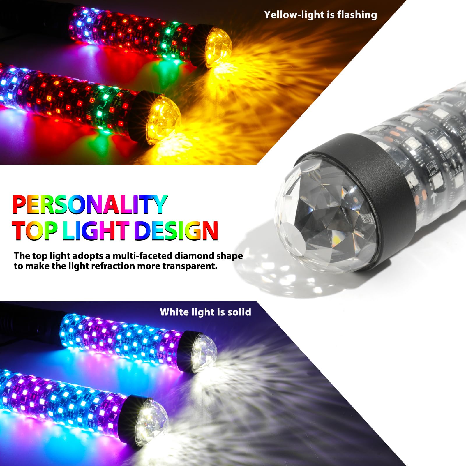 - 【360°Spiral Design & Applicable Car Models/Occasions】Using a more tightly coiled LED design, the whip-like glow of the antenna lighting can provide brighter colors and uniform light in the 360°direction than other products. Not only can it be widely used in off-road, motorcycles, ATV/SUV/UTV, boats, etc., it can also be used in indoor, deck lights, ambient lights, neon lights, etc.