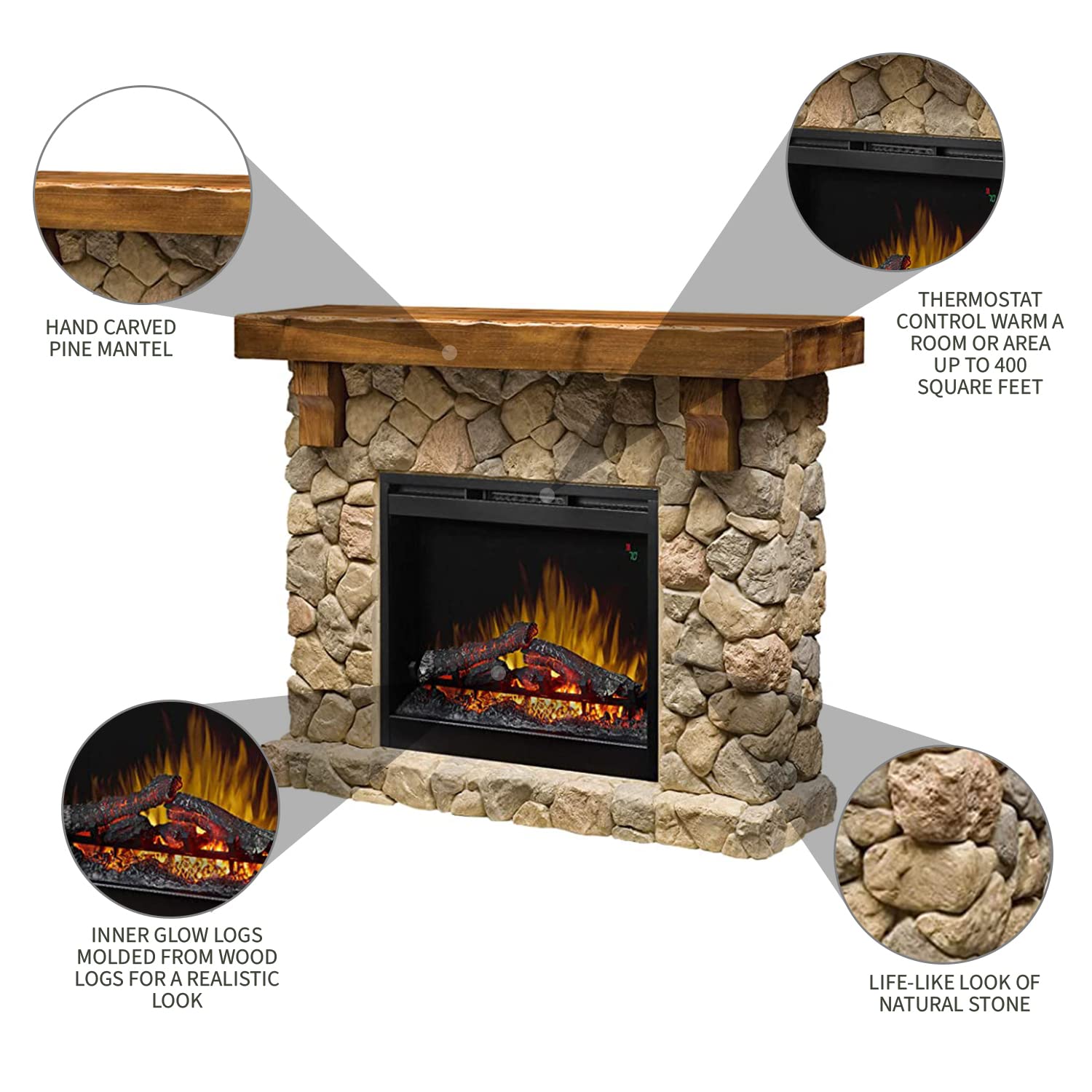 - COST SAVINGS WITH ZONE HEATING: The Fieldstone Electric Fireplace has a 5,118 BTU heater which provides supplemental heat for rooms up to 1,000 square feet and will help heat the rooms you care most about