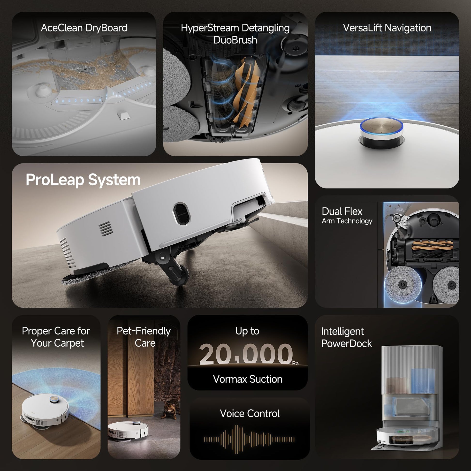 - Easily Clean Under Sofas and More: VersaLift Navigation lowers X50 Ultra height to 3.5 in, allowing it to navigate under furniture easily. The AI camera with LED guidance in tight spots ensures precise navigation and obstacle avoidance.