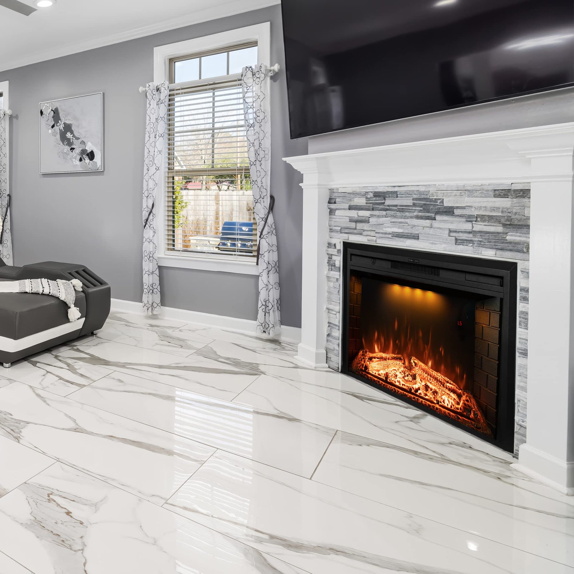 - Both Practical & Decoration: This electric fireplace inserts supply a warm and comfortable environment in the room with two heat options: Low(750W)& High(1500W). Meanwhile, its realistic log and flame with spotlights and cracking sound create a stylish fashionable atmosphere for your family. So it's worth choosing an electric heater fireplace.