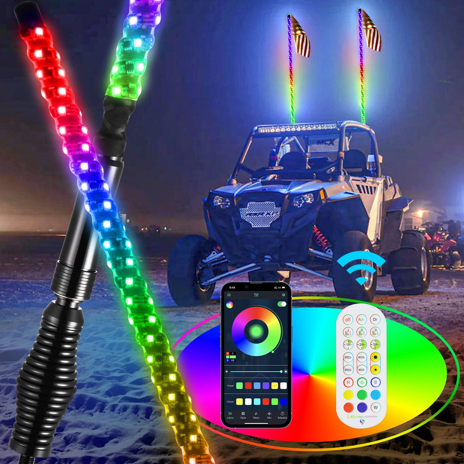 - Spiral RGBW Chasing 5ft Whip Lights: 5 foot whip lights for UTVs with hundreds of colors, dancing patterns, and adjustable brightness and speed settings. The tightly coiled lighted whip design ensures a 360°glow, delivering brighter, more uniform lighting. Ensure your safety on the night trail and always stand out during the ride