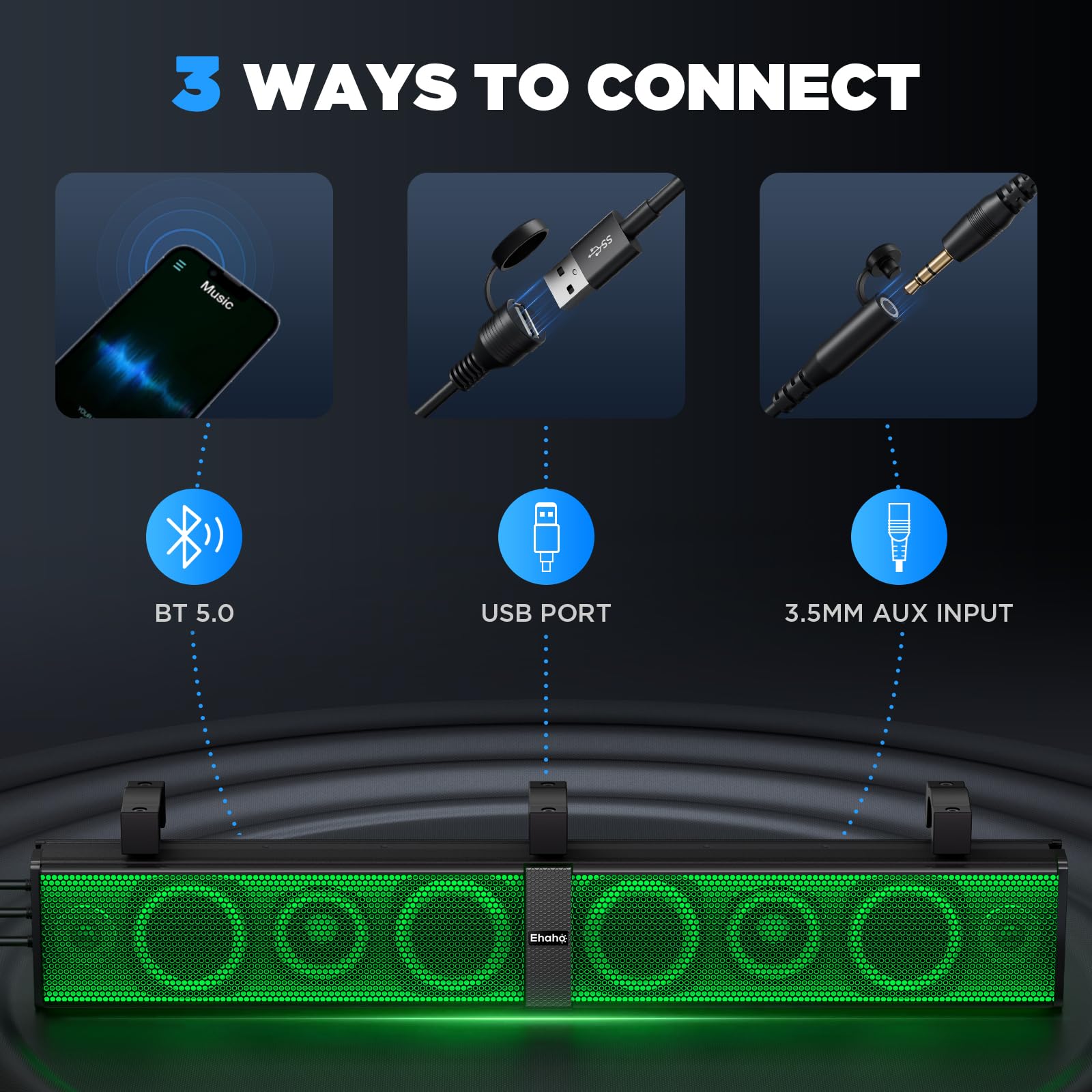 - Syncing with Music: UTV SoundBar features RGB Multi-color LED lights that you can set to hold steady or blink. Compare to others, our lights encircle the speaker unit and sides, casting a more stylish and cooler glow. Syncing the music with dynamic light patterns. Rock your ride and more catching