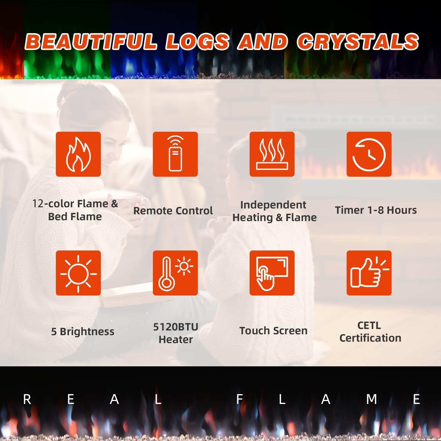 - đ„ă12 Colors Adjustable FlameăThis electric fireplace has 12 realistic flame colors and 5 brightness options. This electric fireplace is designed to choose a log or crystal ember bed. The flame beautifully imitates the burning of a fire, which gradually brightens when it is opened, and slowly extinguishes when it is closed. The flame effect and heating function are independent of each other, and the flame effect can be operated with or without heating.