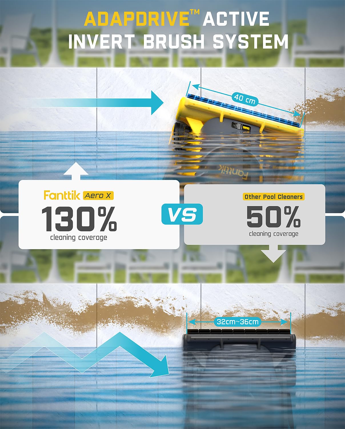 - 130% Waterline Coverage Area: Featuring the AdapDrive active invert brush (80-100RPM auto-adjustment) and AquaPilot navigation system, Aero X cleans 2 inches above the waterline at a 15° angle, 30% more coverage than standard cleaners. The 100RPM brush speed delivers 150% better cleaning efficiency than traditional machines, cleans more waterline stains than traditional horizontal cleaning patterns