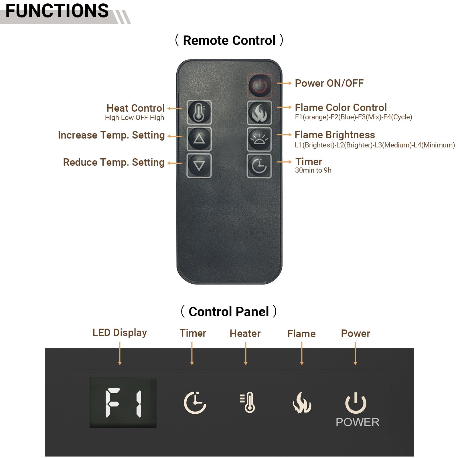 - Touch Screen & Remote Control: The settings like heating mode, flame color, timer and more can be easily found on the touch screen or remote control. The automatic shut-off time can be set from 0.5-9 hours.