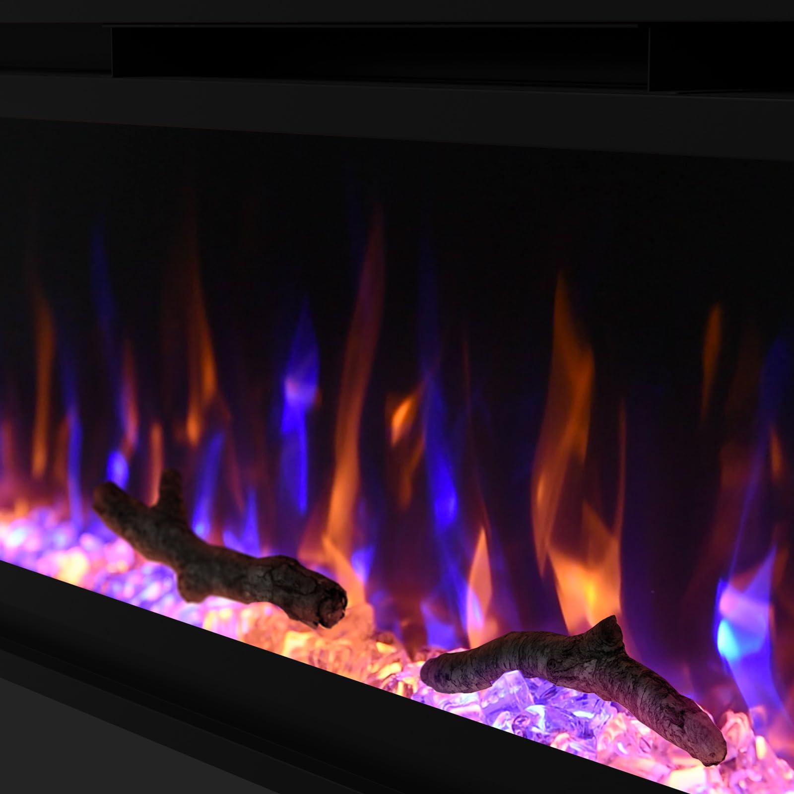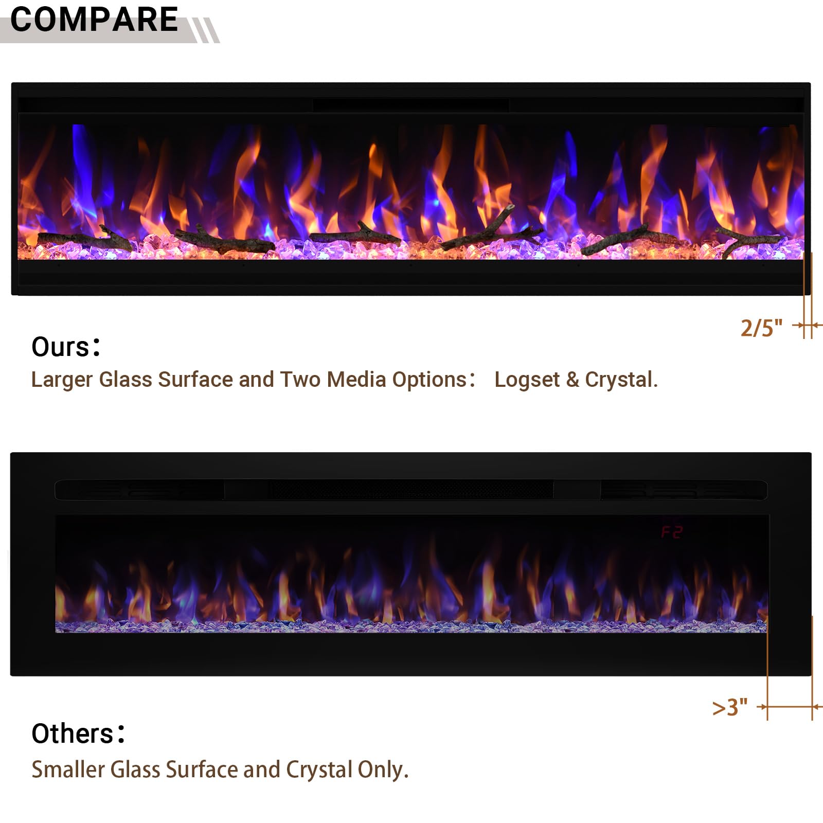 - Stylish Ultra-thin Frame Design: The thickness is only 4.3 inches, creating a more beautiful and ultra-thin effect that ordinary fireplaces do not have. Compared with the same size, the frame is designed to be ultra-narrow and the front glass surface is designed to be larger, showing a more colorful and realistic flame effect.