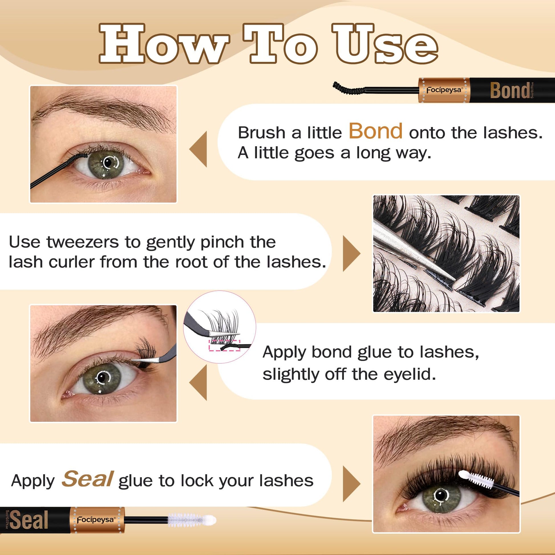 - 【How to use the lash extension kit】: The lashes extension kit is very easy to use at home. Curl your lashes with an eyelash curler. Apply volume cluster lash extension glue to the roots of your volume cluster lashes or lightly brush your natural lashes with a lash bond. Easy to do even if you're a beginner, make DIY cluster eyelash extensions more real like own lashes