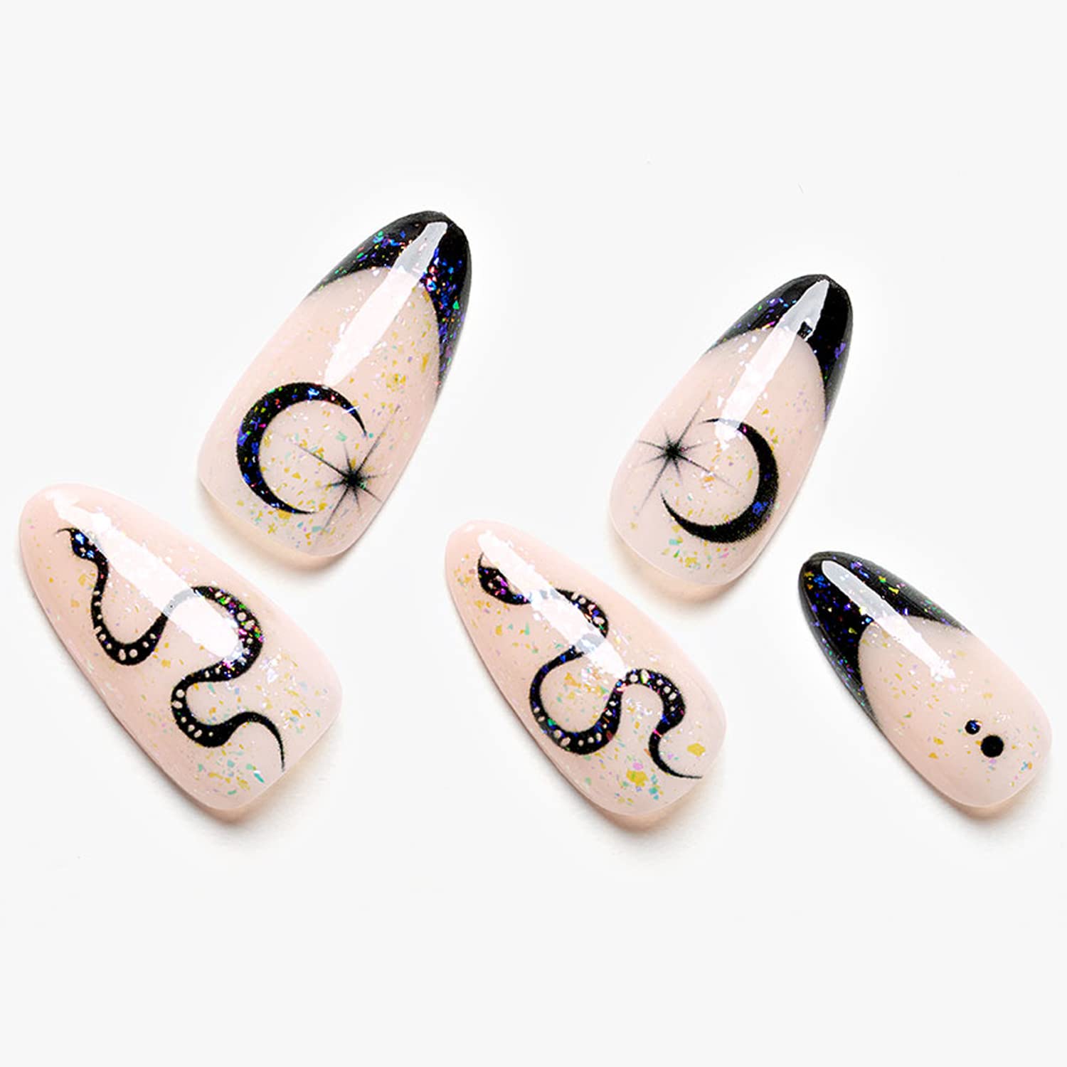 GLAMERMAID Nude White Press on Nail Medium Almond, Natural White Crush Nail, Stiletto Fake Nail with Glitter Snake Design, Short Oval Stick Glue on Nail Tips for Women, Reusable Acrylic False Nail Kit