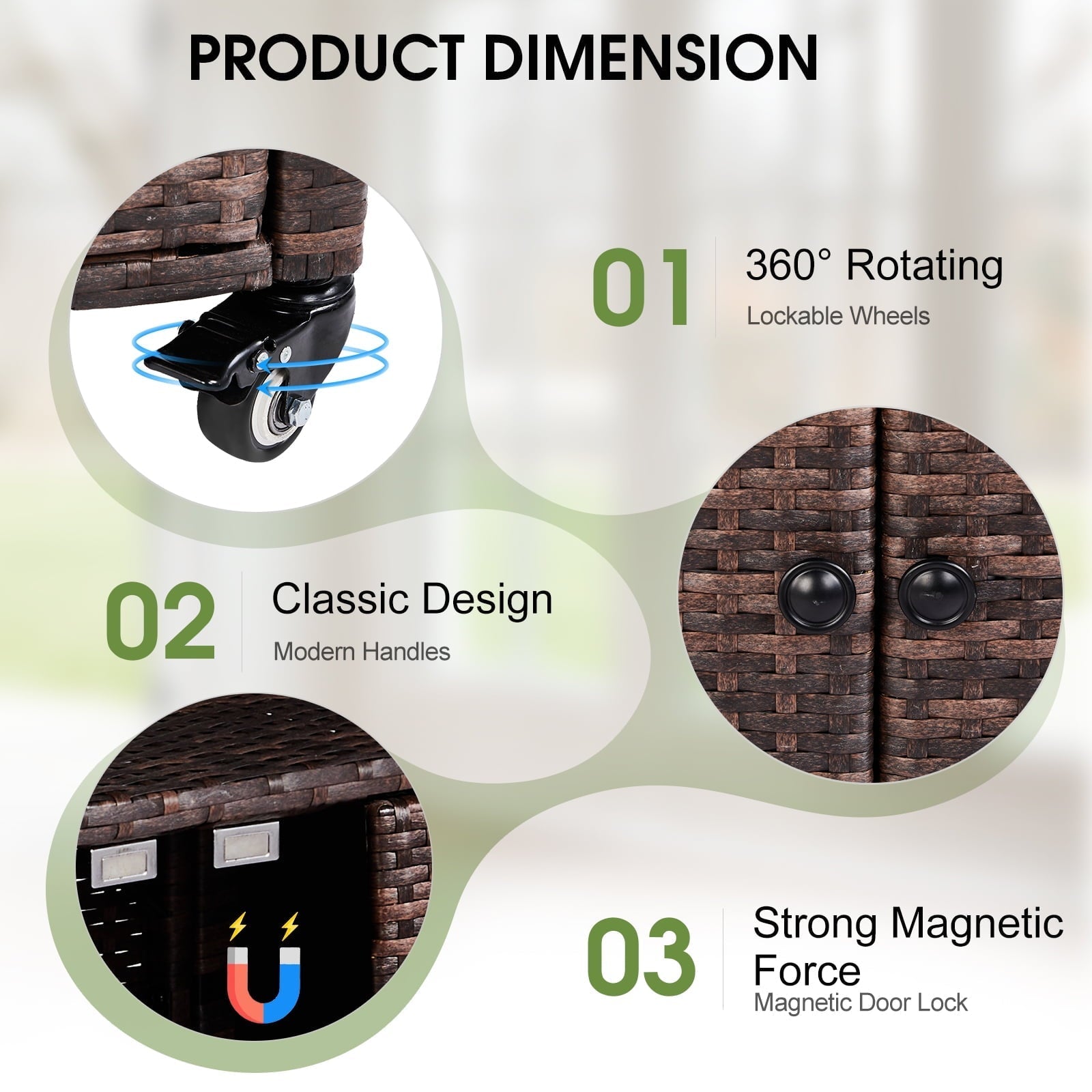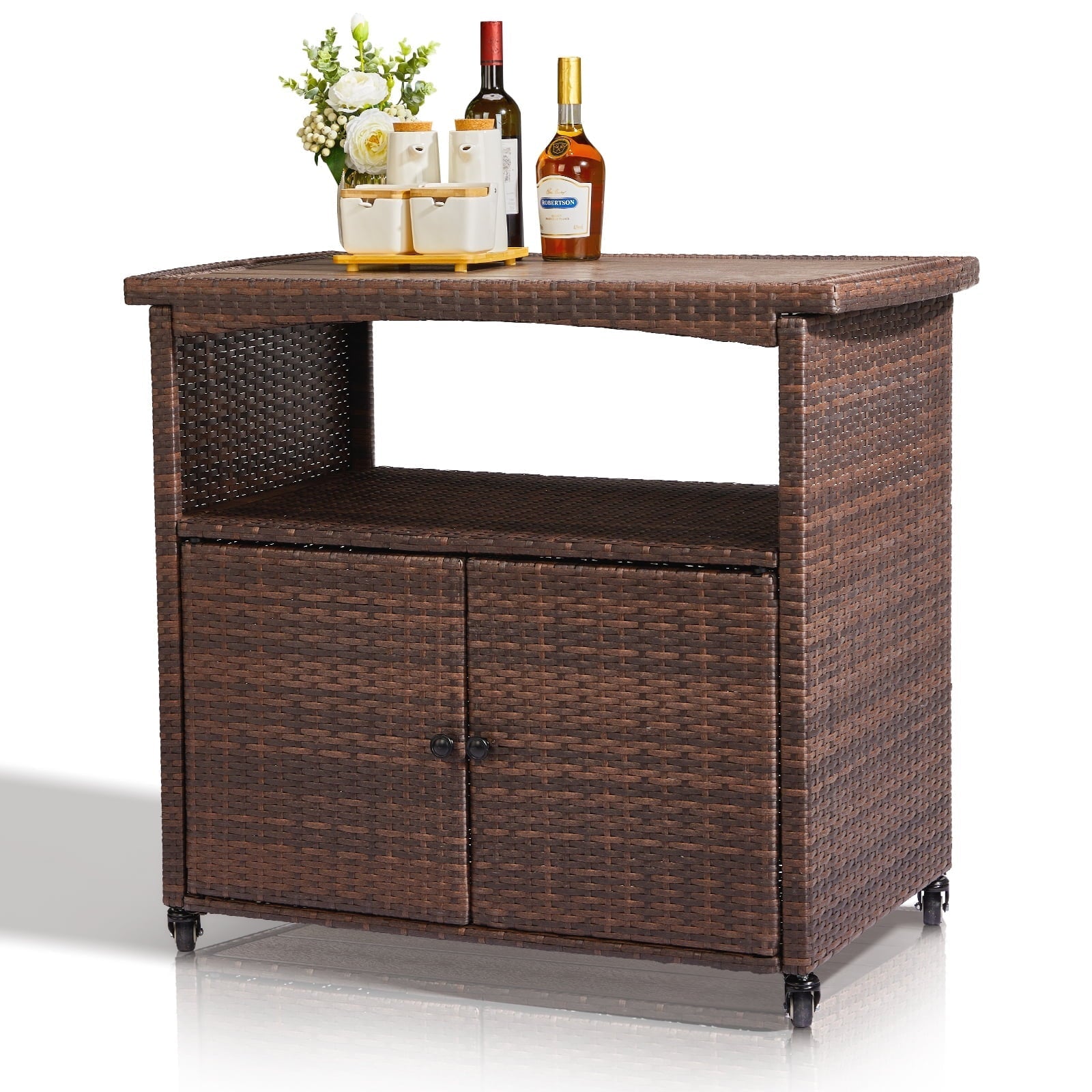 Elevate your outdoor entertaining with our Outdoor Bar Cart with Storage Cabinet. Crafted from all-weather wicker and featuring a durable slatted table top, this multifunctional patio sideboard offers ample storage and a stylish design. Its spacious enclosed cabinet, open middle shelf, and convenient mobility make it the perfect addition for serving drinks, preparing food, or displaying items. Designed to enhance any outdoor setting, this cart is a must-have for garden parties, patio gatherings, and more.