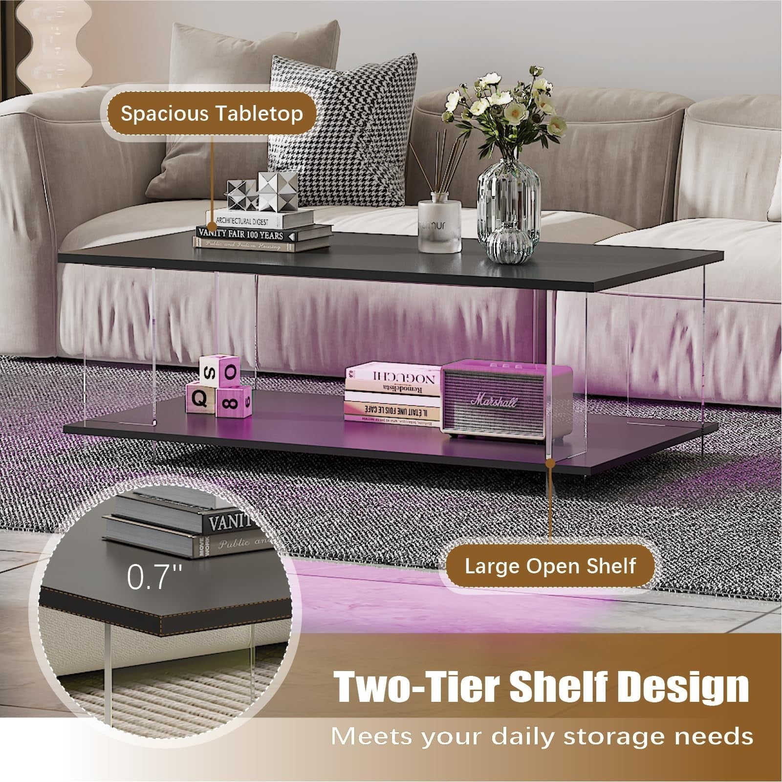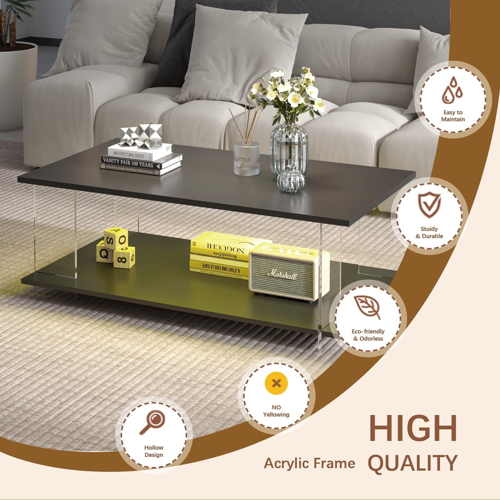 Hironpal 43" Acrylic Coffee Table with Black Wood Top, Minimalist Stylish Modern Rectangular Center Tables for Living Room, Led Living Room Table with Storage Shelf & Acrylic Frame for Small Space