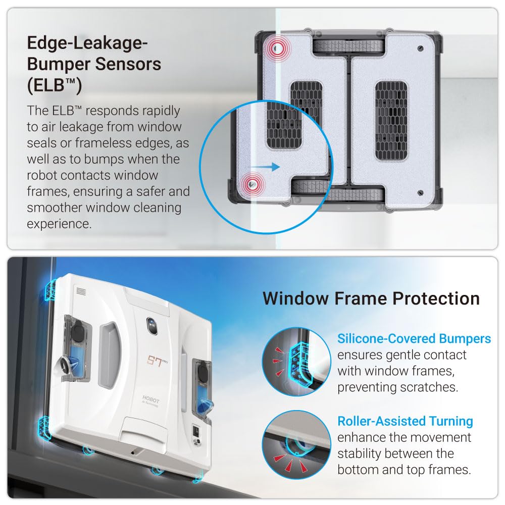 - Edge Leakage Bumper Sensors & Versatile Window Compatibility: HOBOT S7 Pro window robot is designed for framed and frameless windows of any glass thickness, with edge leakage bumper sensors and silicone covered bumpers to prevent scratches and ensure damage-free cleaning.