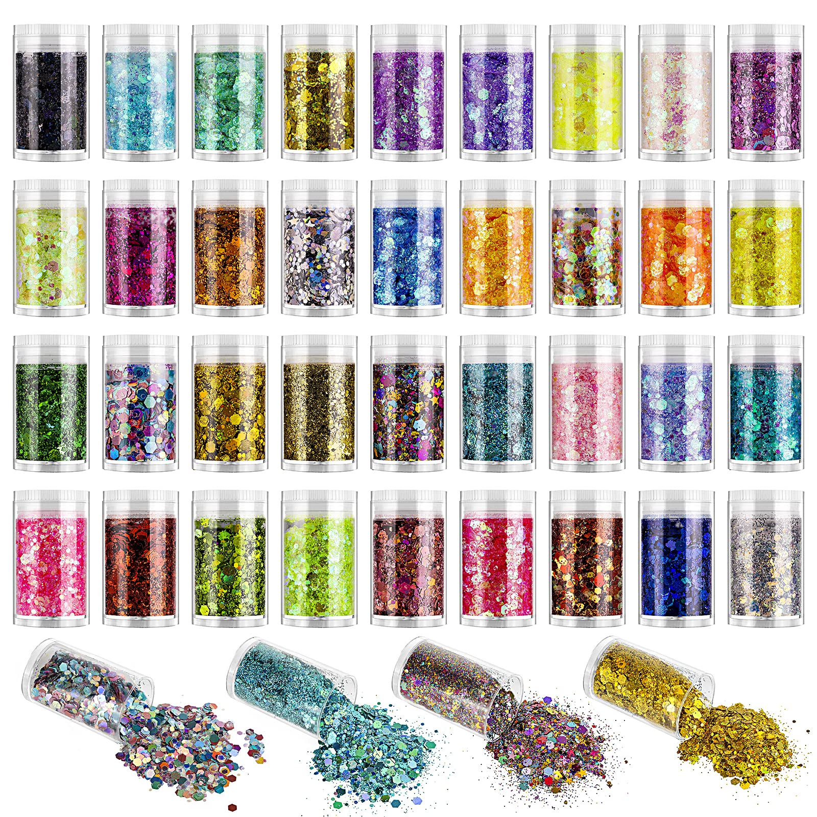 Holographic and Iridescent Chunky Glitter Sequins, 36 Colors Mixed Cosmetic Glitter for Face Body Eye Hair Nail Art Lip Gloss, Festival Glitter Makeup with Different Hexagons Size