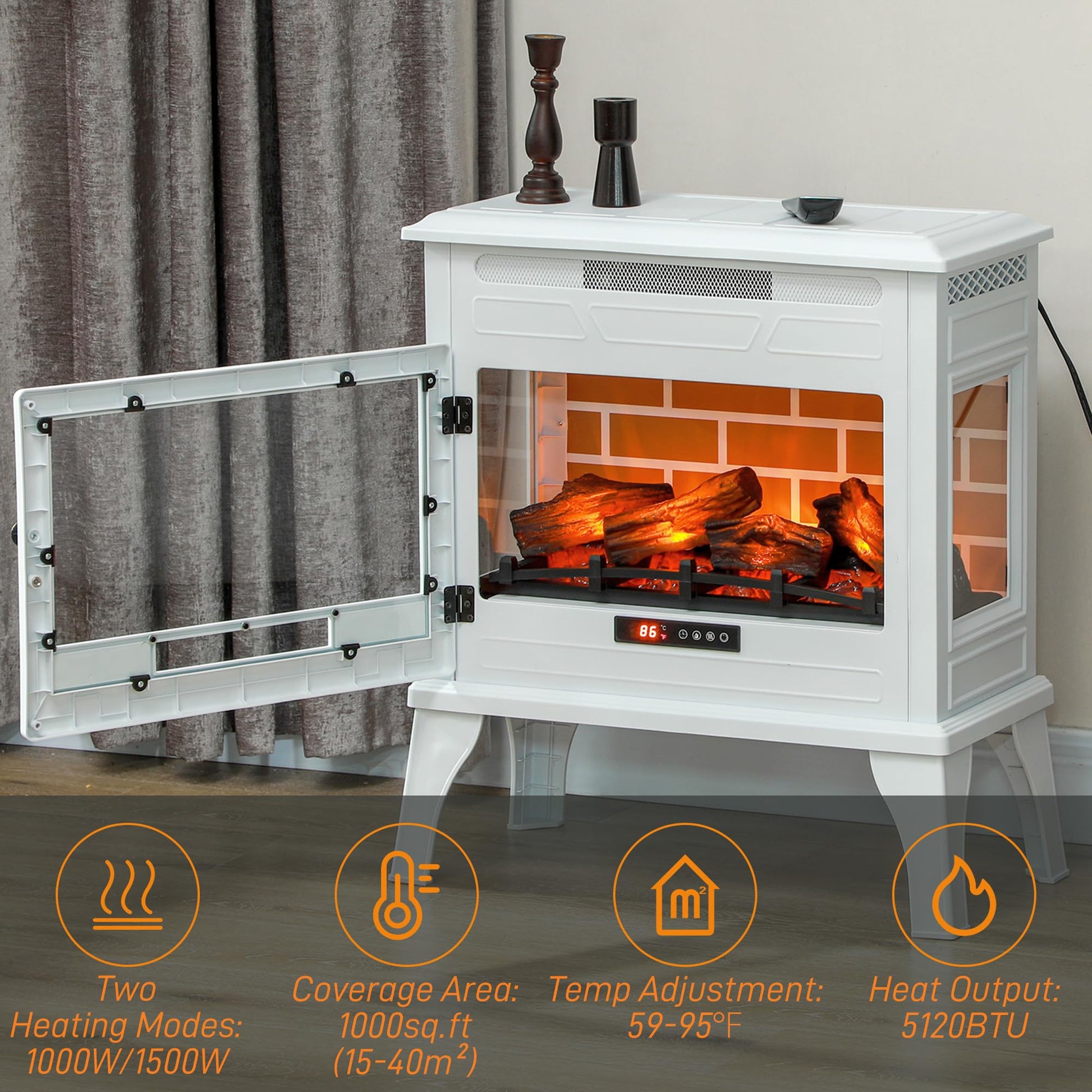 - Adjustable Comfort: Our electric heater fireplace lets you choose between 1000W and 1500W settings to efficiently heat spaces up to 1000 sq ft. Customize your room temperature from 59-95°F for optimal comfort.