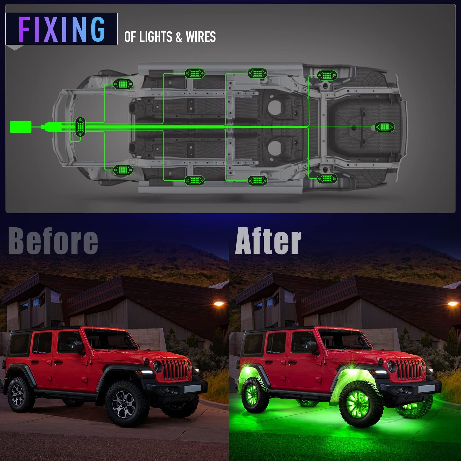 - ▶【Extra Wiring for Added Length】This RGB led rock lights kits includes extra wiring length for different vehicles. The length of each pod cords is about 118 inches. If your car is large, you may need to purchase additional extension cables. Purchase Rock Light Extension Wire ASIN: B0BL72N5XW