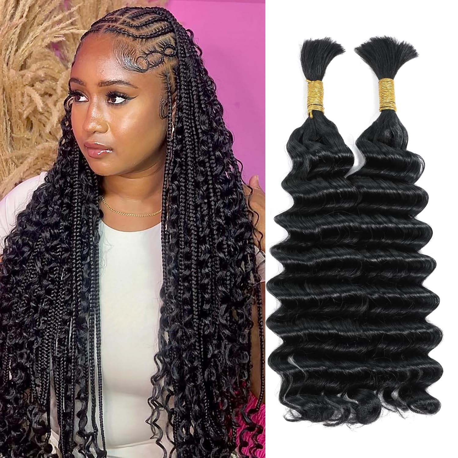 Human Braiding Hair Deep Wave Bulk Human Hair for Braiding No Weft 2 Bundles 100g Wet and Wavy Human Braiding Hair for Boho Braids 100% Brazilian Virgin Curly Hair for Braiding Hair Extensions 24 Inch