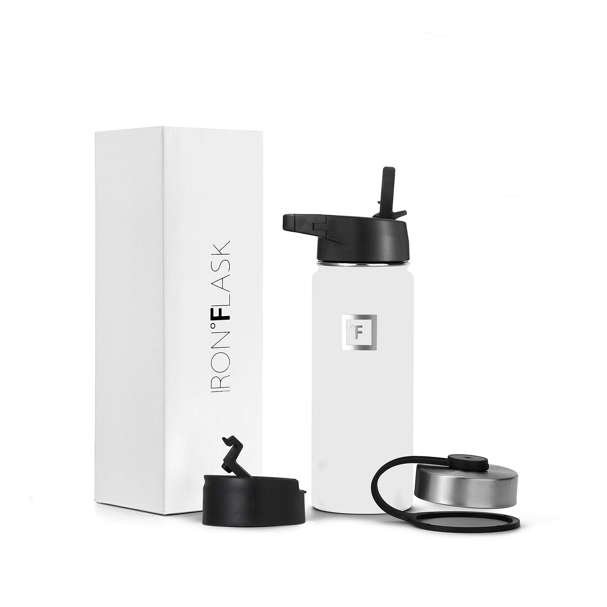 IRON °FLASK Camping & Hiking Hydration Flask, Wide Mouth, 3 Straw Lids, Stainless Steel Outdoor Water Bottle, Double Walled, Insulated Thermos, Metal Canteen - Winter White, 18 Oz