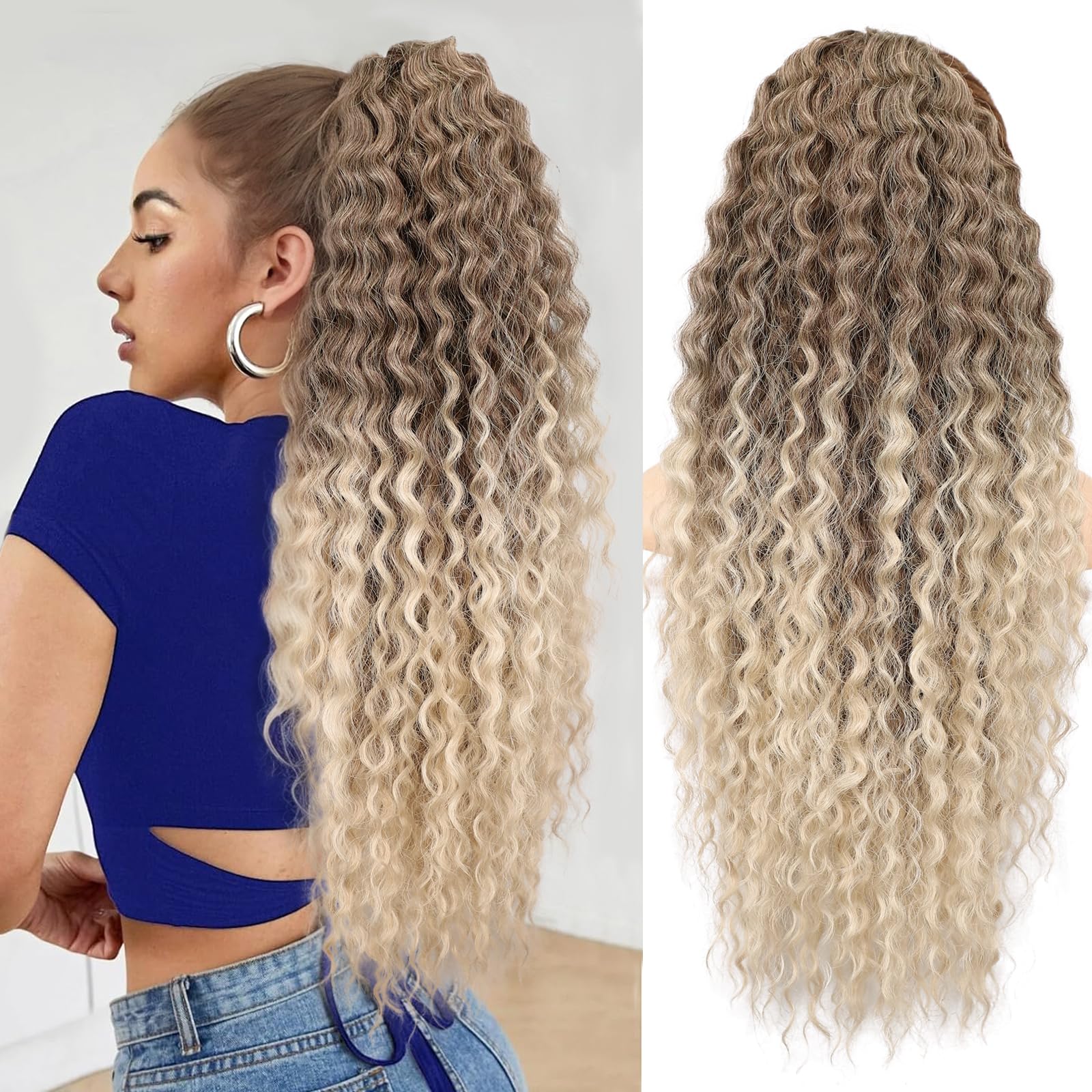 Isaic Ponytail Extensions 26inch Drawstring Ponytail Extensions for Women Long Curly Ombre Brown Mix Blonde Ponytail Synthetic Hair Extensions for Daily Use