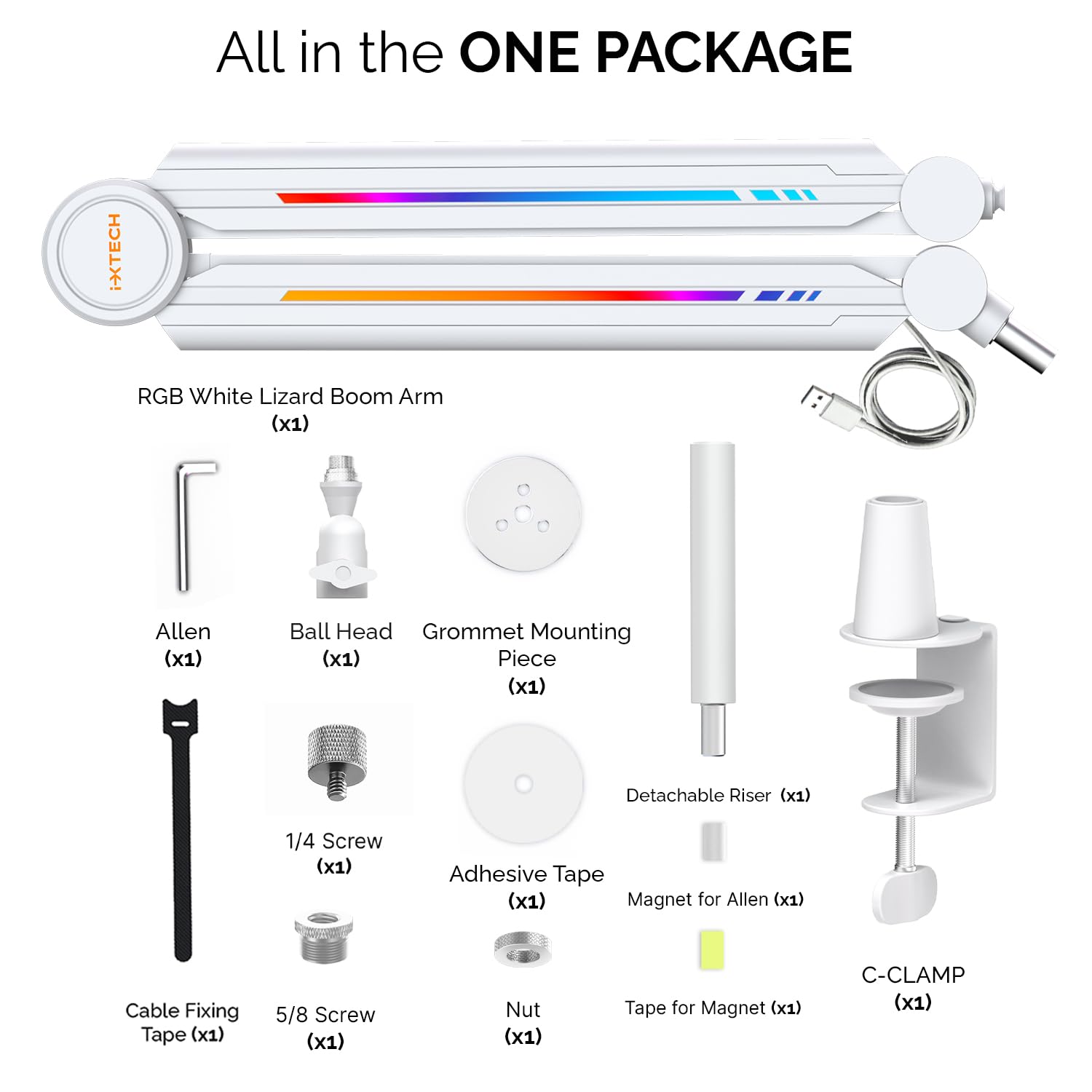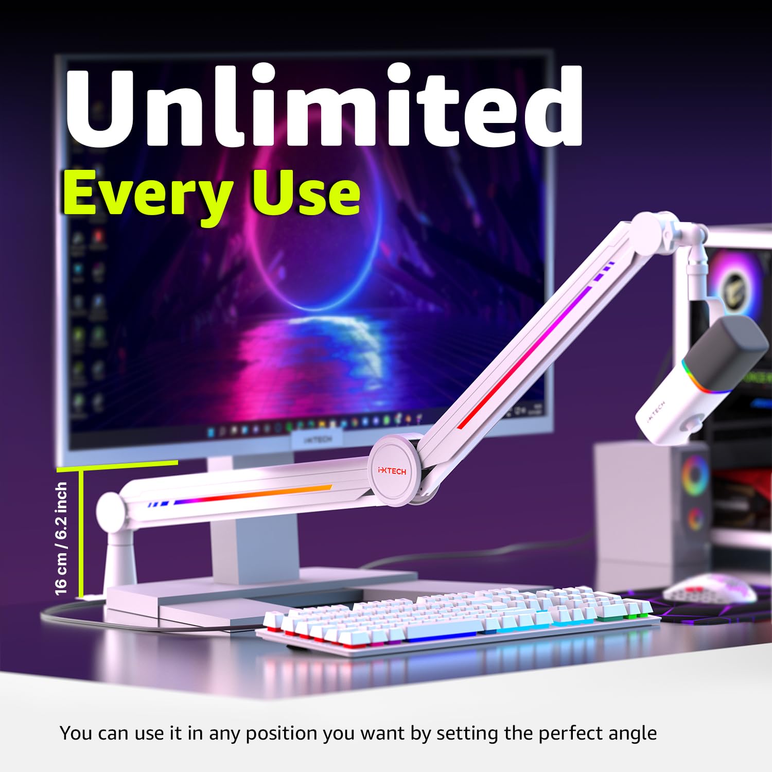 IXTECH RGB Mic Boom Arm High Profile, Overhead Boom Arm Microphone Stand Desk Mount, Adjustable Microphone Stand with Desk Mount, Mic Arm for Live Streaming Gaming Podcasting Recording (White)