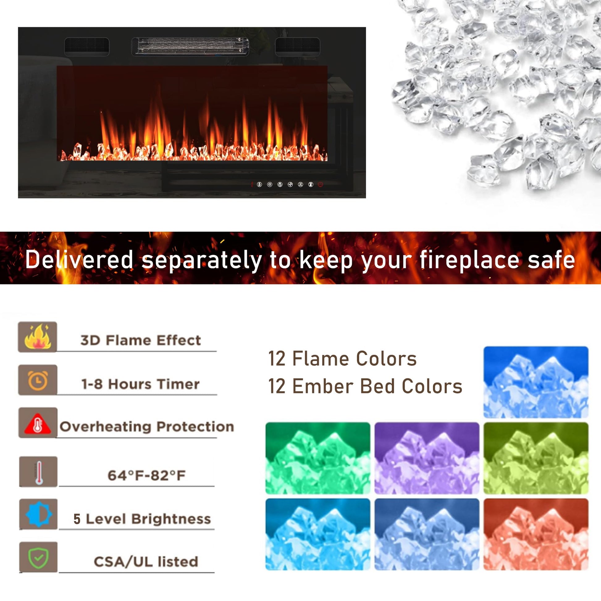 - 36' Wide Crystal Electric Fireplace】Fireplaces with tempered glass can be well protected, equipped with a clear crystal ember bed, this eletronic fireplace heater goes beyond the feeling of burning coal in a traditional fireplace without any noise, creating a comfortable relaxing space for you. You can control the power switch and easily adjust the flame brightness and temperature through the included infrared remote control or operation panel, 1-8 hour timer and overheat protection ensu