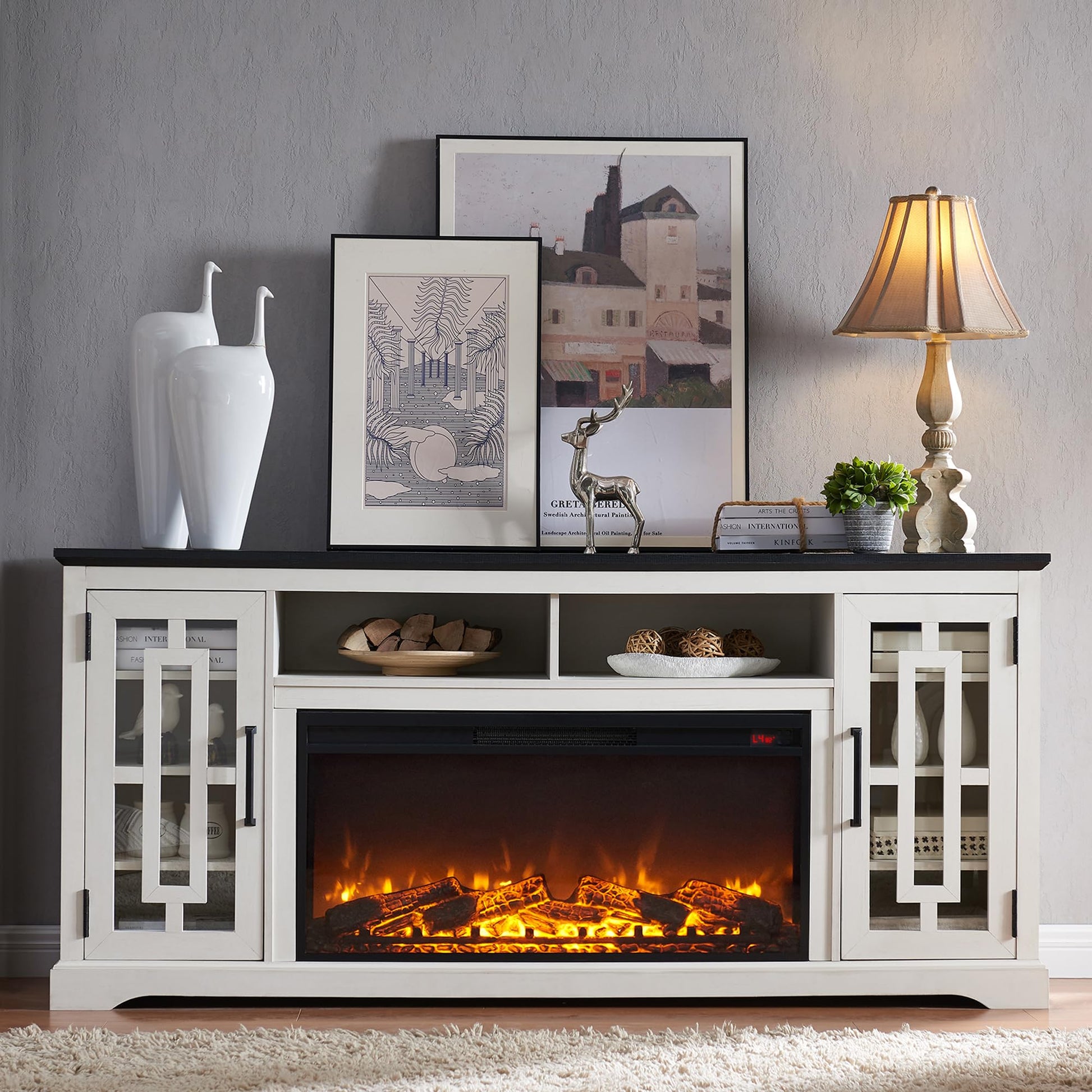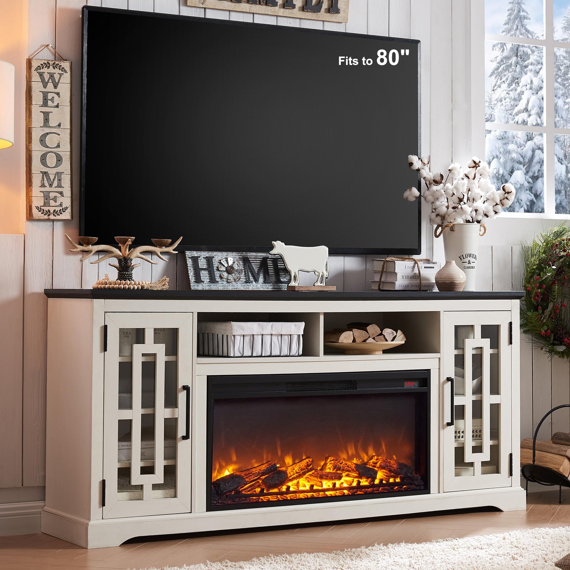 - Elevate Your Living Space: Experience the perfect blend of rustic charm and modern elegance with our 70' Elegant Rustic Fireplace TV Stand. Measuring 70'W x 15.5'D x 32'H, it accommodates TVs up to 75-80 inches, becoming the focal point of your living room. Adorned with side cabinets featuring glass doors and decorative mullions, it showcases your style. Stay organized with three adjustable shelves and enjoy the timeless allure of the weathered finish that complements any home décor.