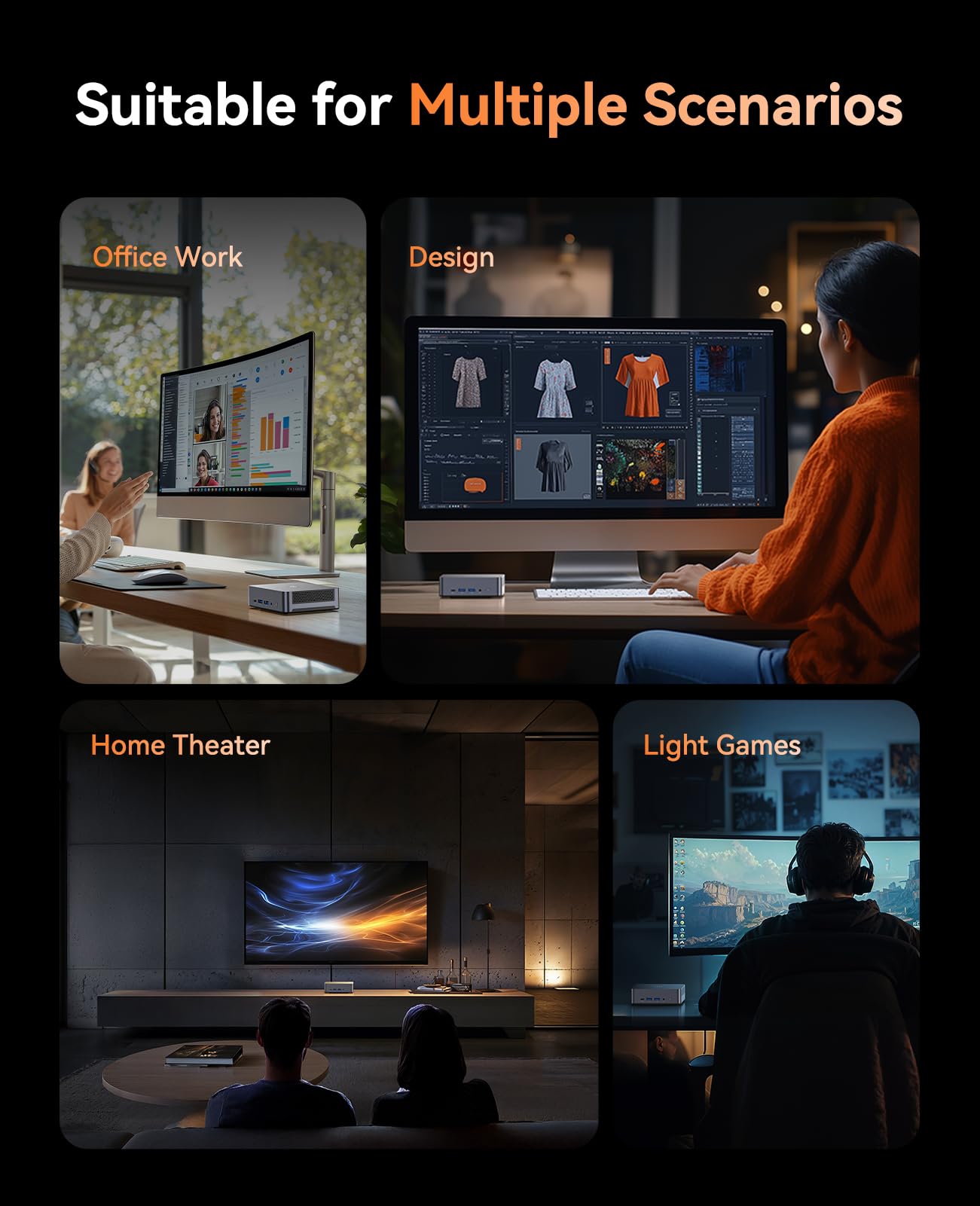 - 【Quad 4K Display OUTPUTS】 The AM21 mini desktop computer integrates AMD Radeon 680M 2400MHz GPU, giving you powerful graphics processing capabilities to help you focus on 4K ultra high definition vision. Watching videos, playing games, doing office work, and creating have truly become a form of enjoyment. output 4K@60Hz Transmit UHD video signals through DP+2 * HDMI 2.1+USB 3.2 Type-C full functionality, achieve immersive visual experience through quad 4K display, and help you concentrate and inspire while creating