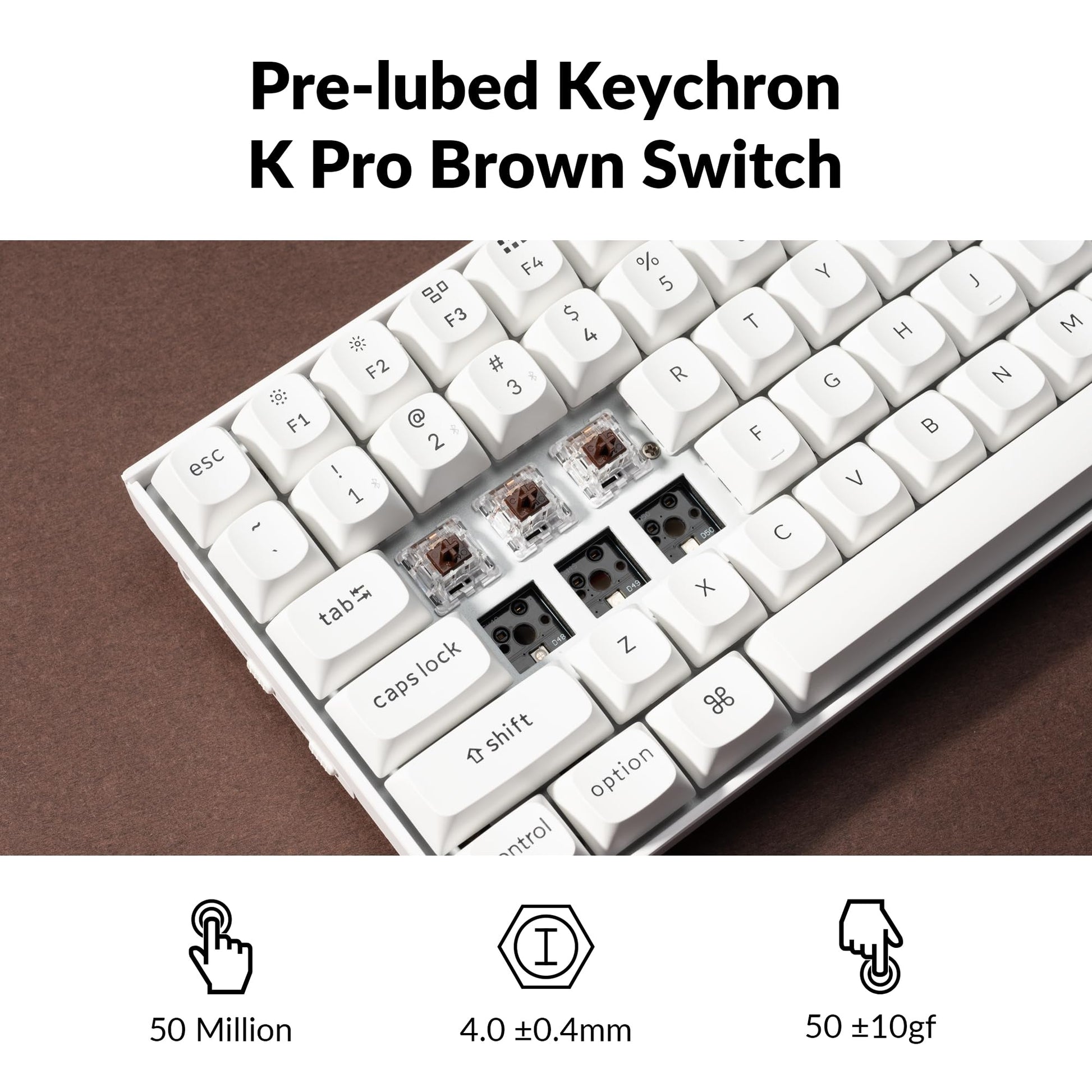 - You can hot-swap every switch on the K2 Pro with almost all of the 3pin and 5pin MX style mechanical switches on the market (including Cherry, Gateron, Kailh, Panda, etc.) without soldering. Pre-installed the pre-lubed Keychron K Pro mechanical brown switch providing tactile feeling with up to 50 million keystroke lifespan.