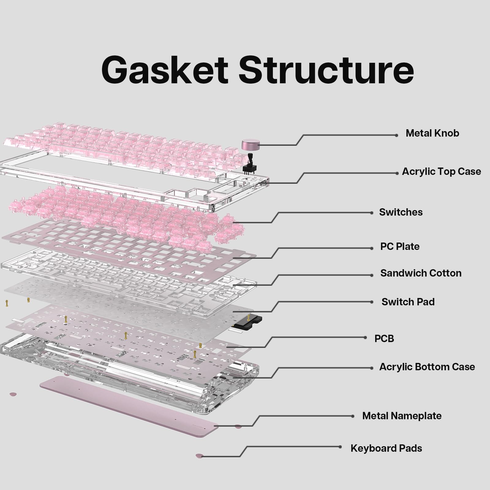 - 【Enhanced Gasket Mount and PC Plate】The KiiBOOM Phantom 81 in V2 and V3 version feature an upgraded PC (Polycarbonate) Plate, specifically designed to harmonize with the Gasket Mount system, enhancing the keyboard's performance and your typing experience. This mounting style is highly regarded in the mechanical keyboard community due to the unique typing feel it provides. When combined the gasket mount, the PC plate helps to produce a pleasant typing sound and a slightly flexible, cushioned feel on each keystroke.