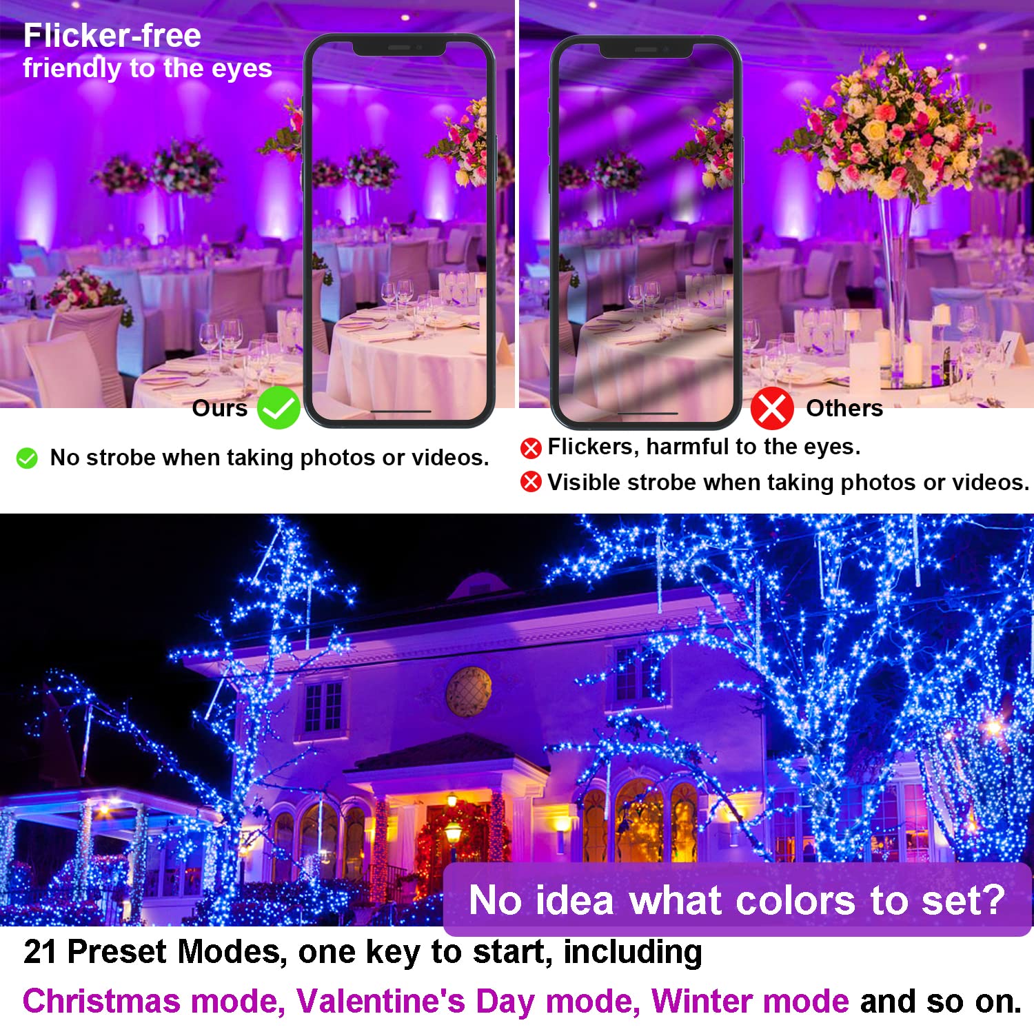 - 【21 Preset Modes +2 DIY Scene】23 different modes, including Christmas mode, Valentine's Day mode, Winter mode and so on. Just click button to start it. If you want to set the color and speed by yourself, there are 2 DIY Modes. You can set the color or mode of outdoor flood light individually or grouply, match it to your favorite scene in advance(such as party, barbecue, garden landscape, etc.).