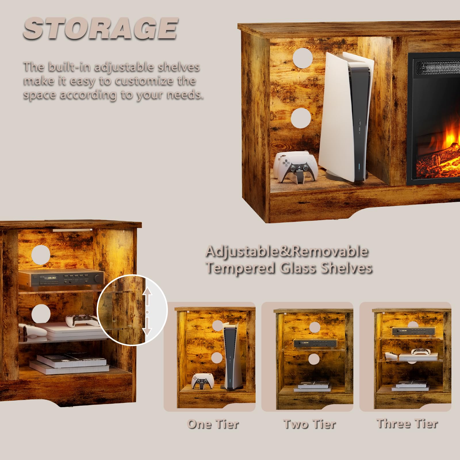 - TV Stand with Electric Fireplace: The TV stand perfectly combines a 58 inch TV cabinet with an 18 inch electric fireplace. It can heat rooms up to 350 sq. ft and can be chosen from 2 temperature settings (750/1500 W),also includes a 1-8 timer. The 3D realistic flame effect can be operated with or without heat to create a warm atmosphere. The flame can not be changed color, but it can be changed brightness,from L1 to L5 level. It is equipped with digital LED display and remote control, can be operated remotely or by the button attached to the fireplace. Conveniently and easily to understand.