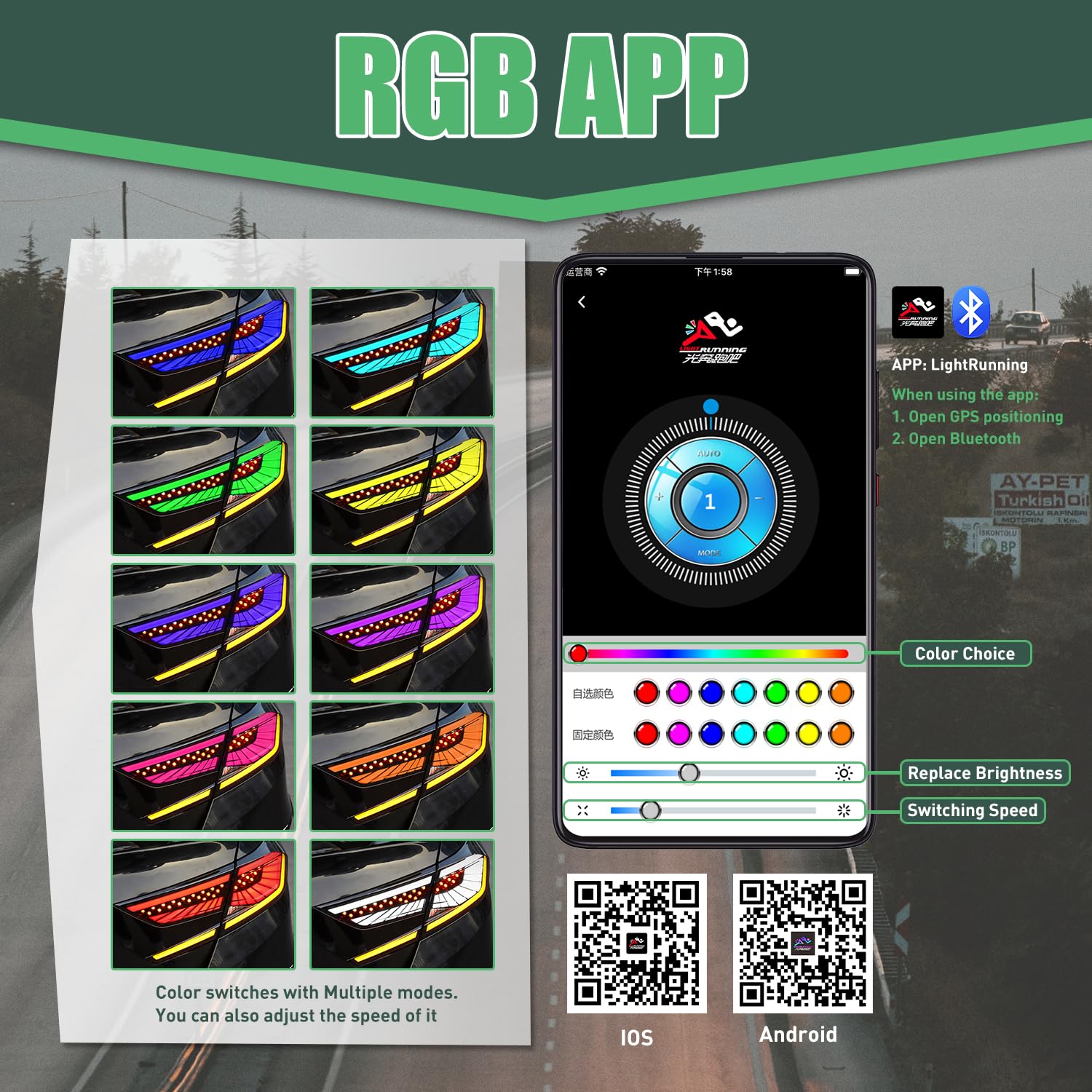 - [Multi-Color Customization]:You can easily change the color of your tail lights using the app 'LightRunning' and control them remotely via your phone for a standout look. Switch to a normal (legal) light with the click of a button on your remote