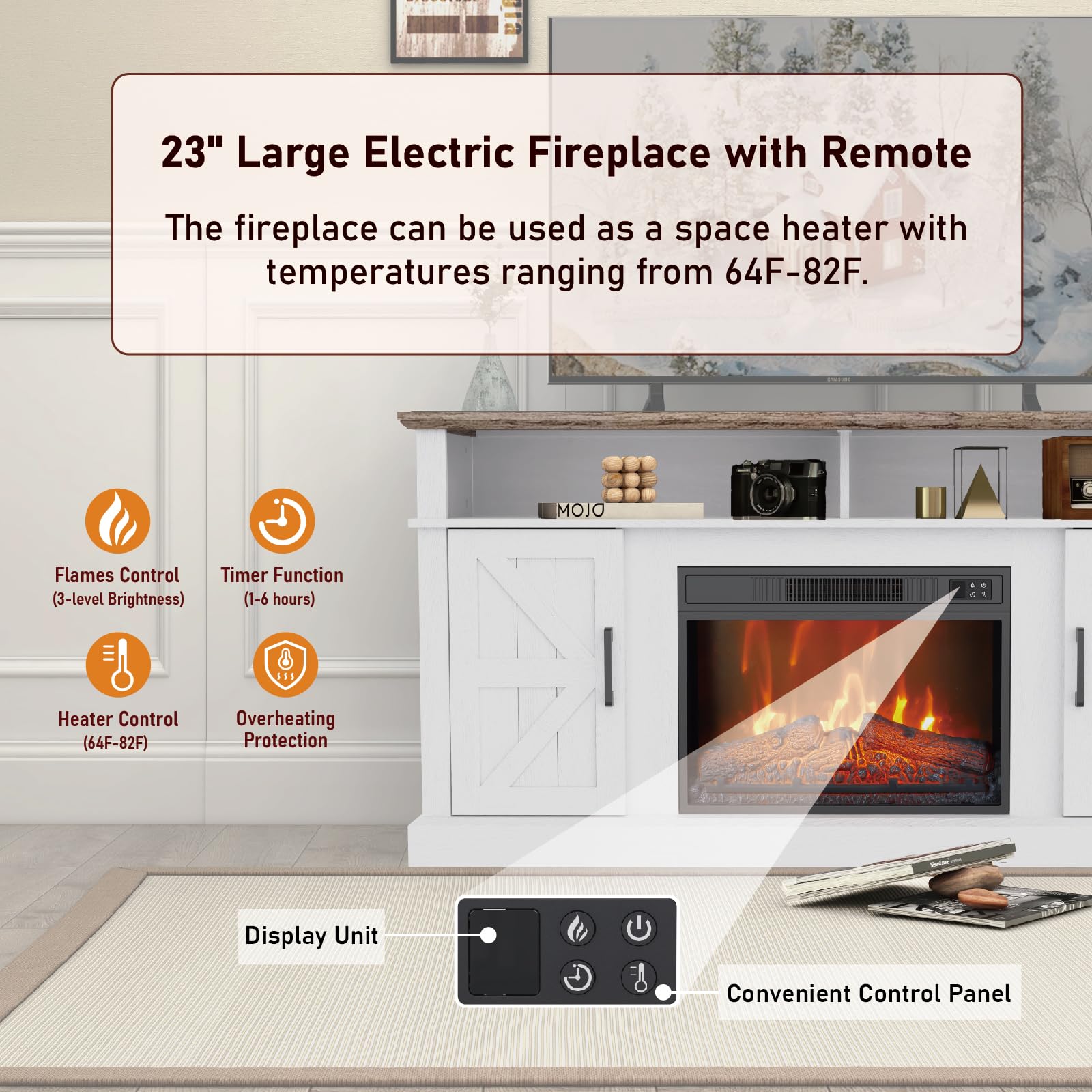 - 【23' Electric Fireplace】: The TV Stand's electric fireplace offers adjustable heat from 64 to 82 degrees Fahrenheit.Heater up a large room and keep longer warm. Electric Fireplace boasts a realistic flame effect and lifelike logs, creating an inviting ambiance. The included mobile remote control allows you to effortlessly adjust flame intensity, switch settings, and control the fireplace from the comfort of your seat.